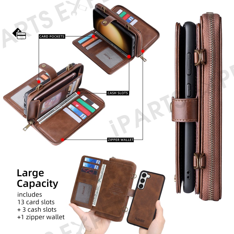 Designed with 13 card slots, cash compartments and zipper pocket for convenient storage