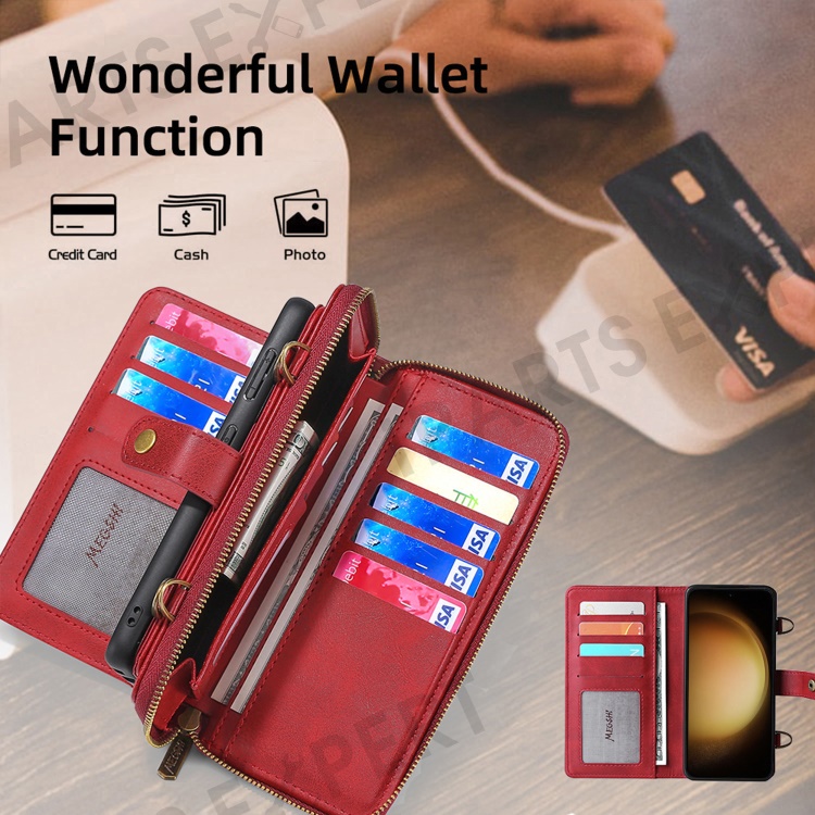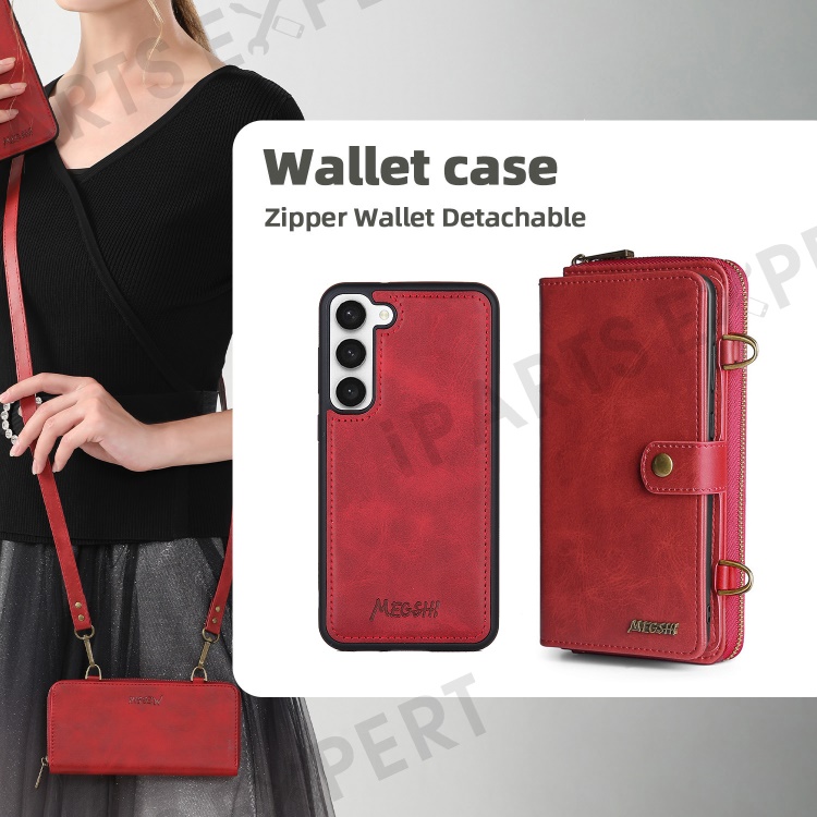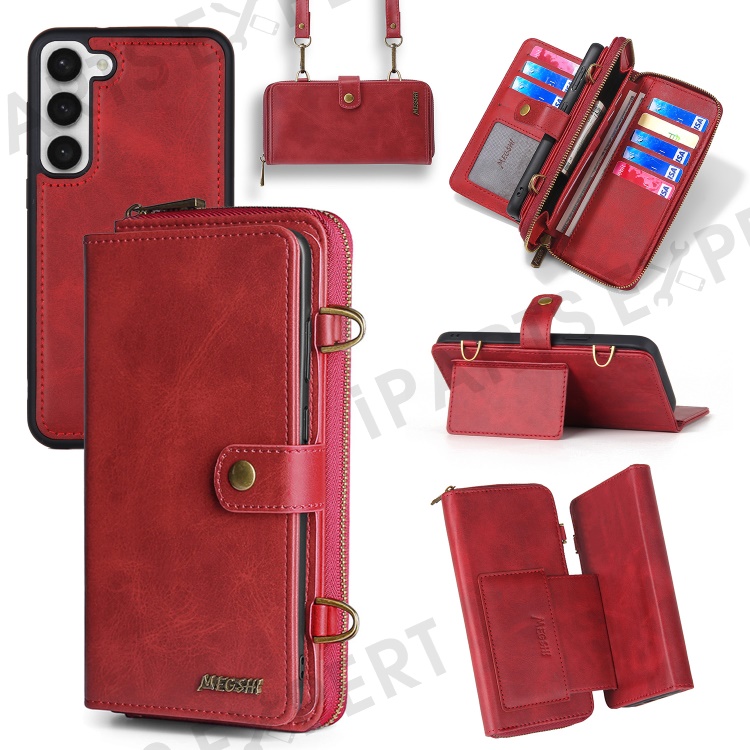 MEGSHI 020 Series for Samsung Galaxy S23 Detachable 2-in-1 PU Leather+PC+TPU Phone Wallet Stand Case with Shoulder Strap - Red