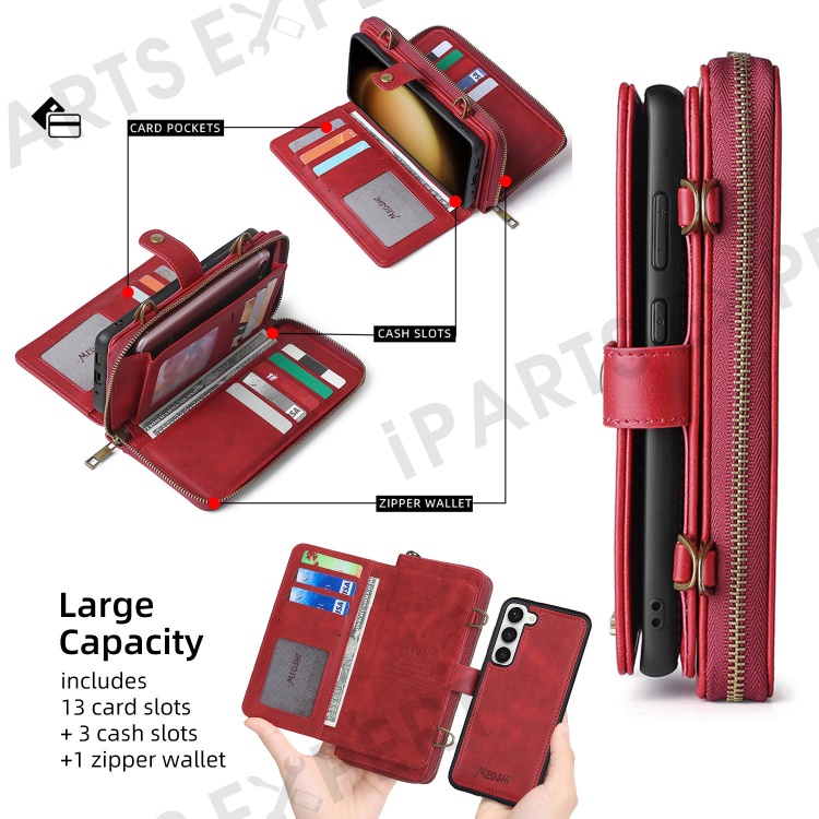 Designed with 13 card slots, cash compartments and zipper pocket for convenient storage