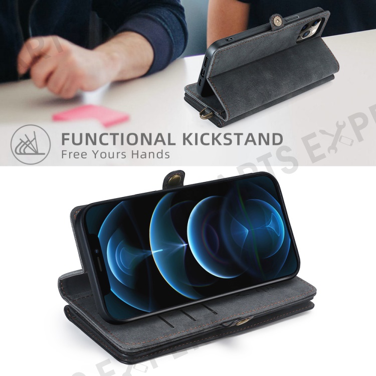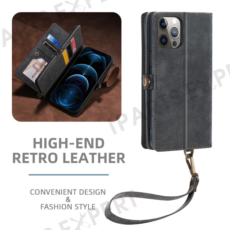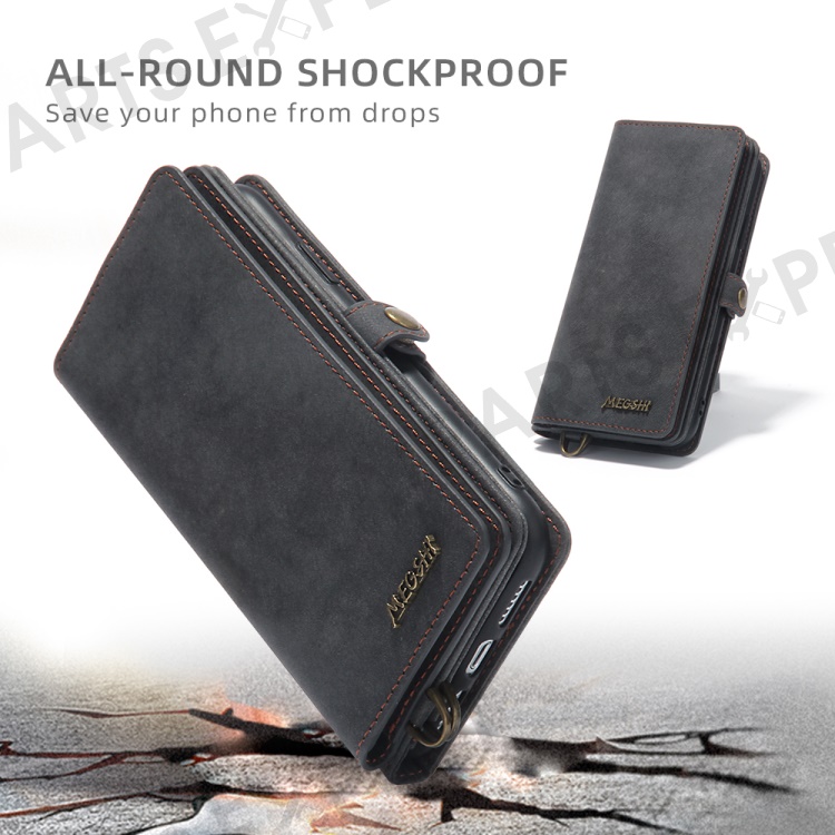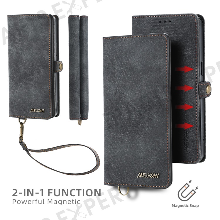 MEGSHI 021 Series Full Protection Wrist Strap Detachable 2-in-1 Magnetic Wallet Design Phone Case with Stand for iPhone 13 Pro Max 6.7 inch - Black