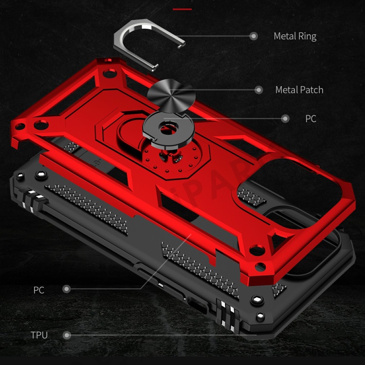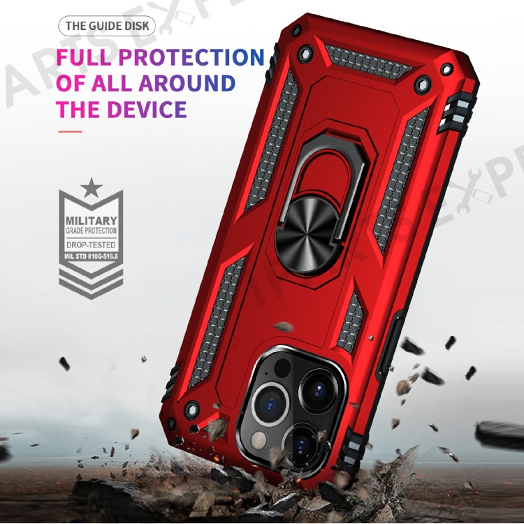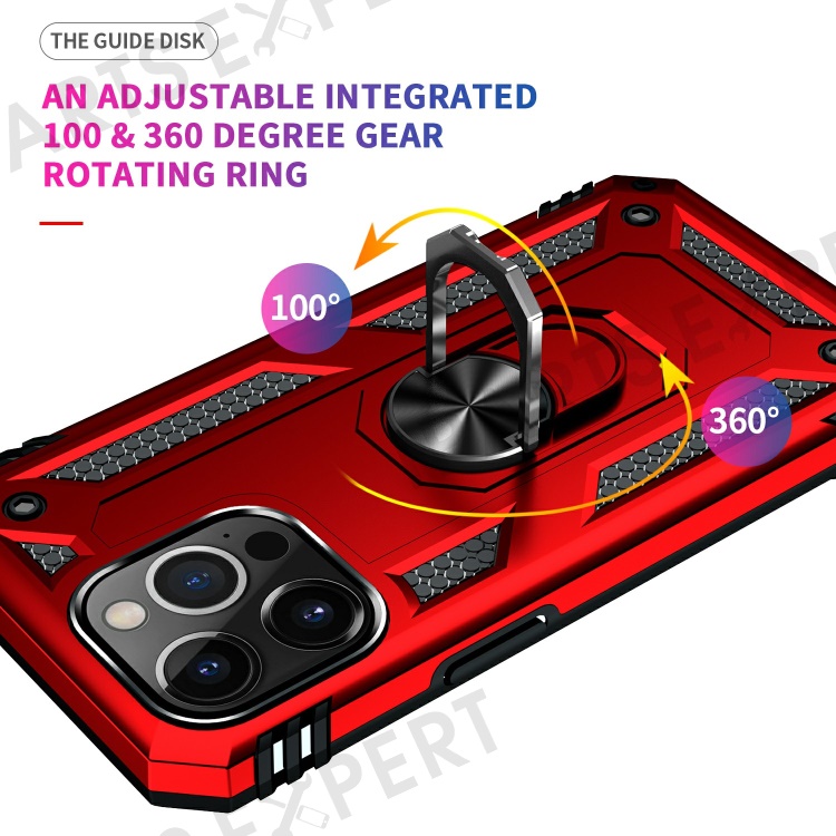 Military Grade PC TPU Shockproof Protection Case for iPhone 13 Pro Max 6.7 inch with Car Mount Rotary Ring Kickstand - Red