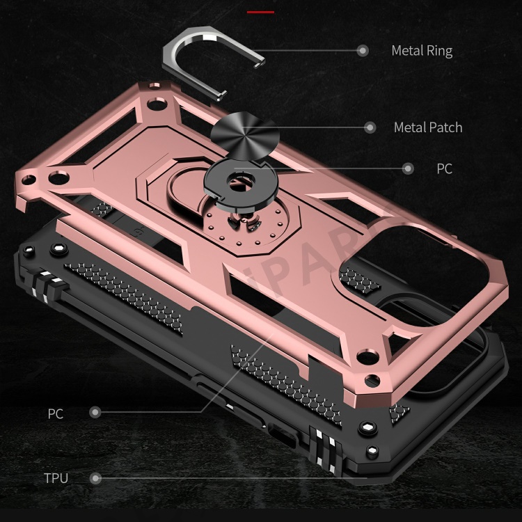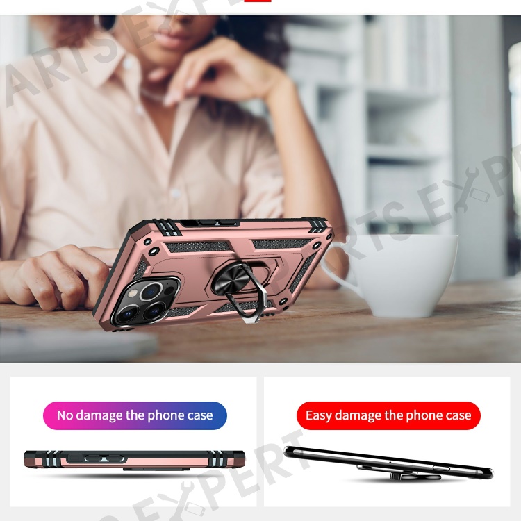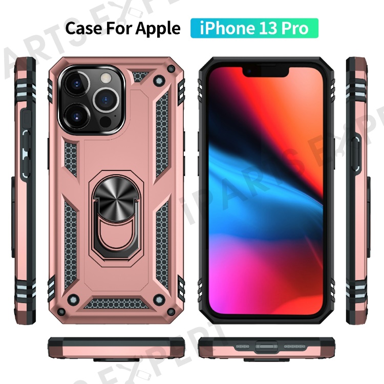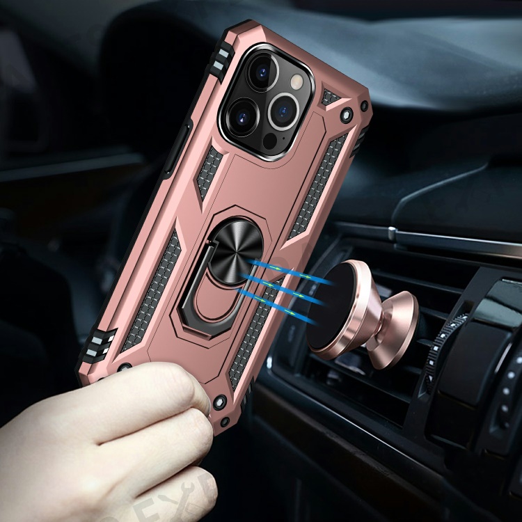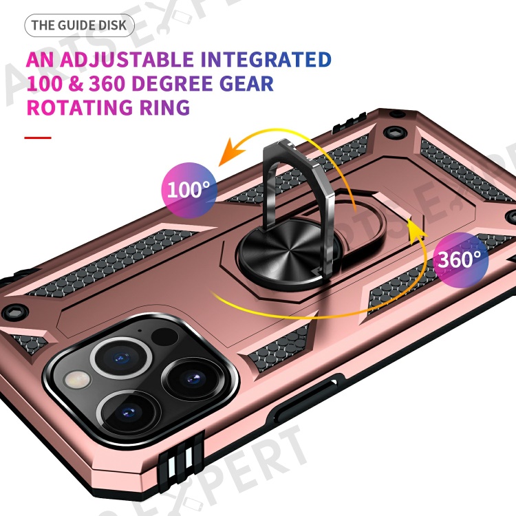 Military Grade PC TPU Shockproof Protection Case for iPhone 13 Pro Max 6.7 inch with Car Mount Rotary Ring Kickstand - Rose Gold