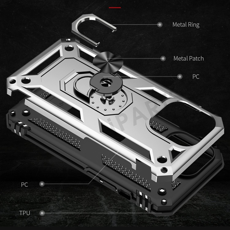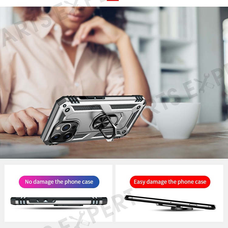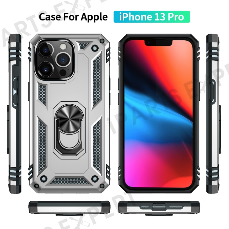 Military Grade PC TPU Shockproof Protection Case for iPhone 13 Pro Max 6.7 inch with Car Mount Rotary Ring Kickstand - Silver