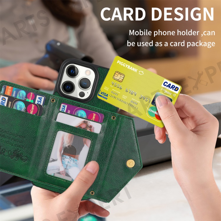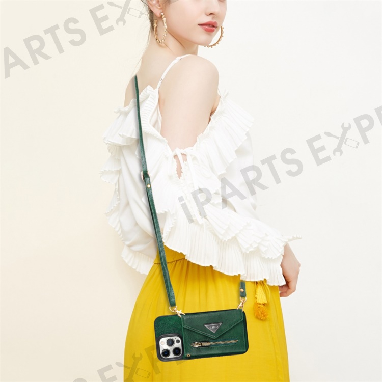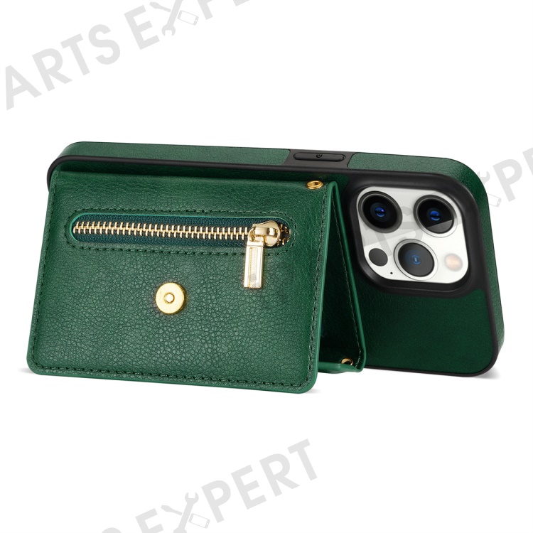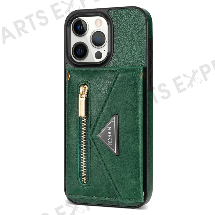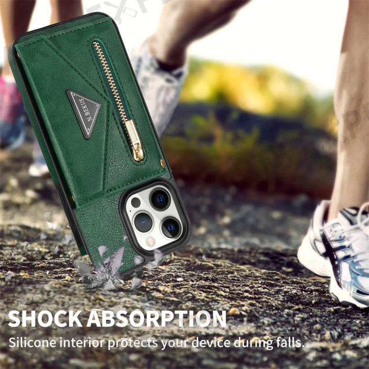 N.BEKUS For iPhone 16 Pro Case Card Slot Zipper Wallet Leather Phone Cover with Shoulder Strap - Green