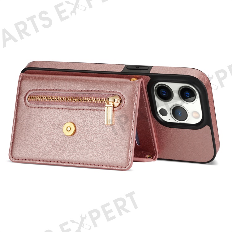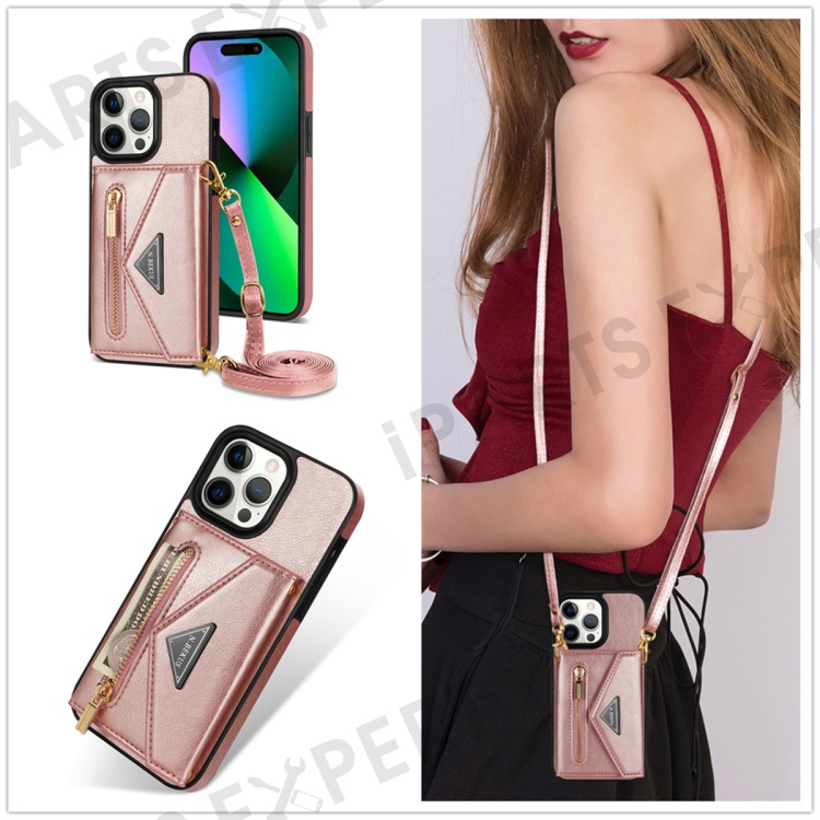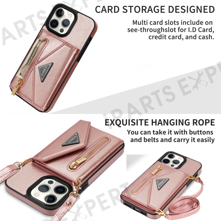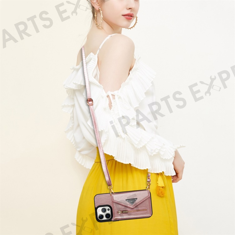 N.BEKUS For iPhone 16 Pro Case Card Slot Zipper Wallet Leather Phone Cover with Shoulder Strap - Pink