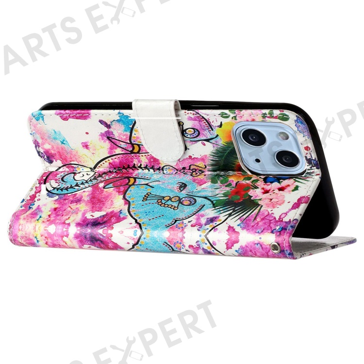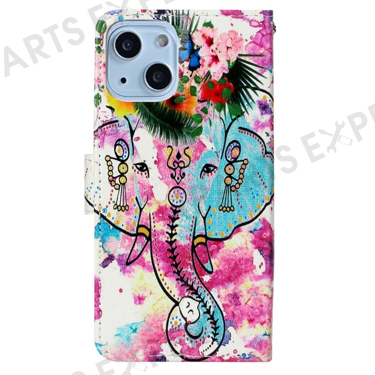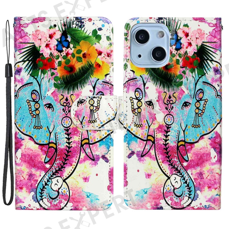 Pattern Embossed Phone Case for iPhone 14 6.1 inch, PU Leather TPU Wallet Stand Shockproof Cover with Hand Strap - Elephant