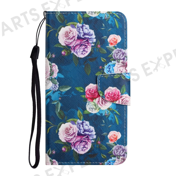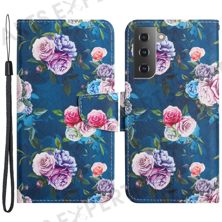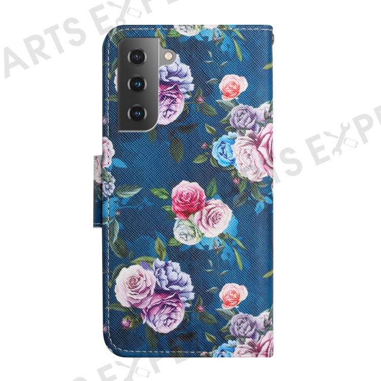 Pattern Printing All-round Protection Leather Phone Case Wallet Stand Cover Shell with Wrist Strap for Samsung Galaxy S22 5G - Fluorescent Rose
