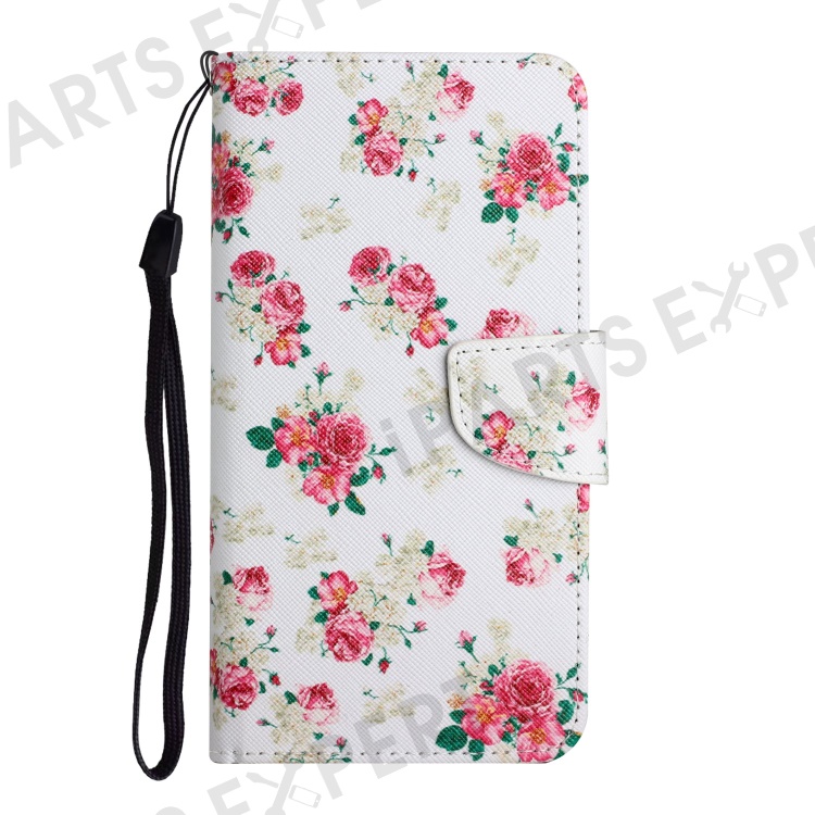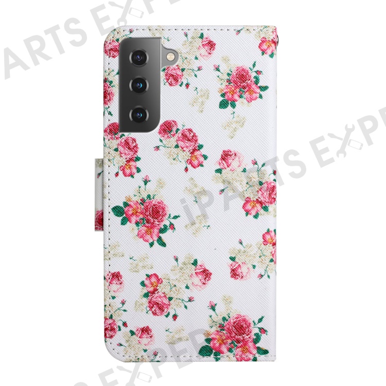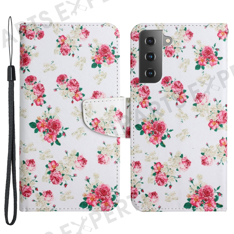 Pattern Printing All-round Protection Leather Phone Case Wallet Stand Cover Shell with Wrist Strap for Samsung Galaxy S22 5G - Red Peony Flower