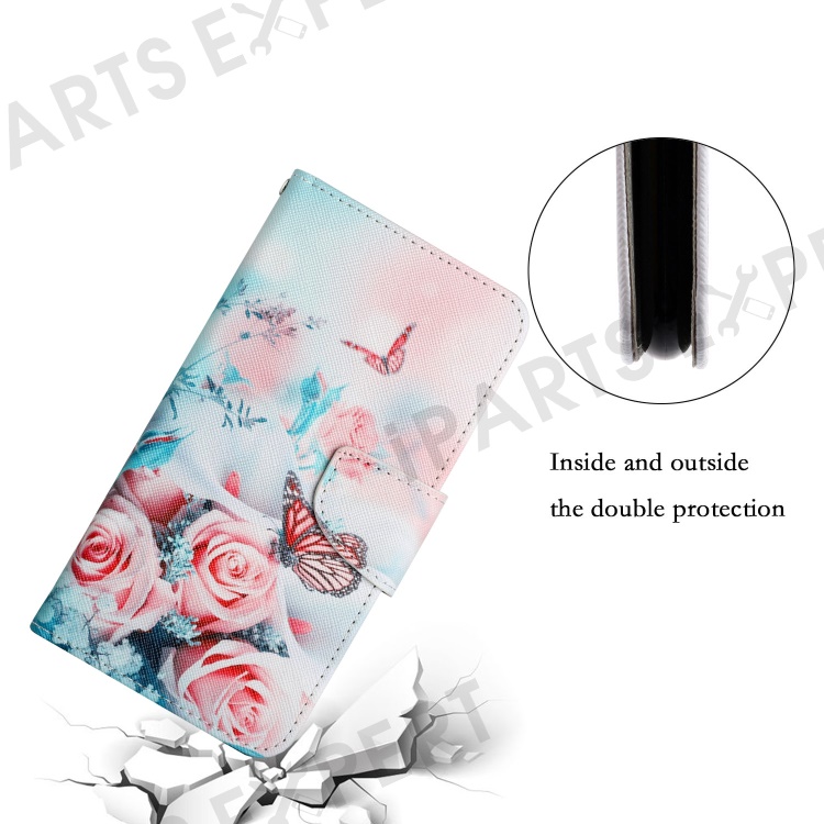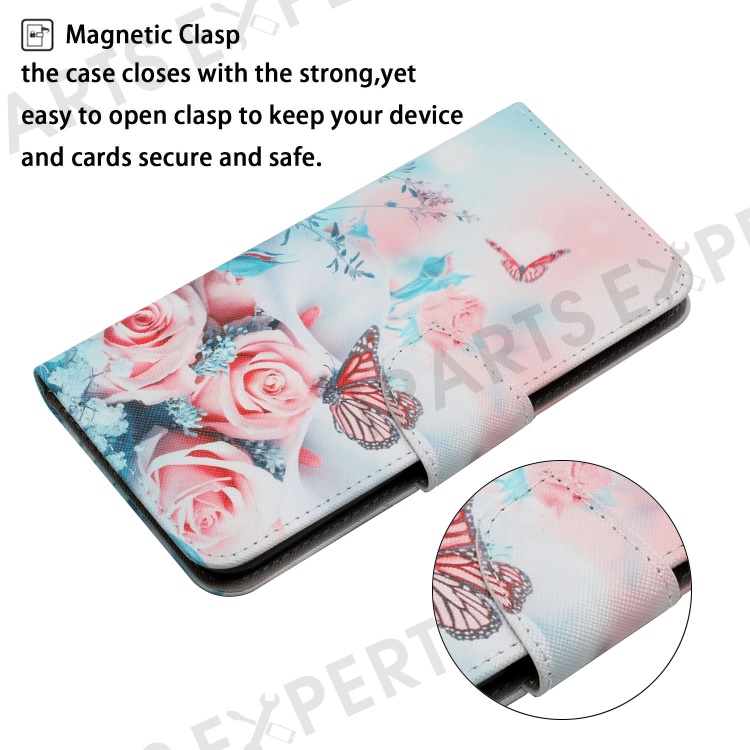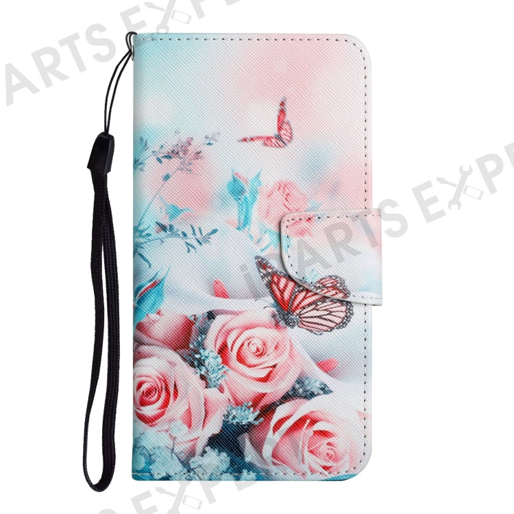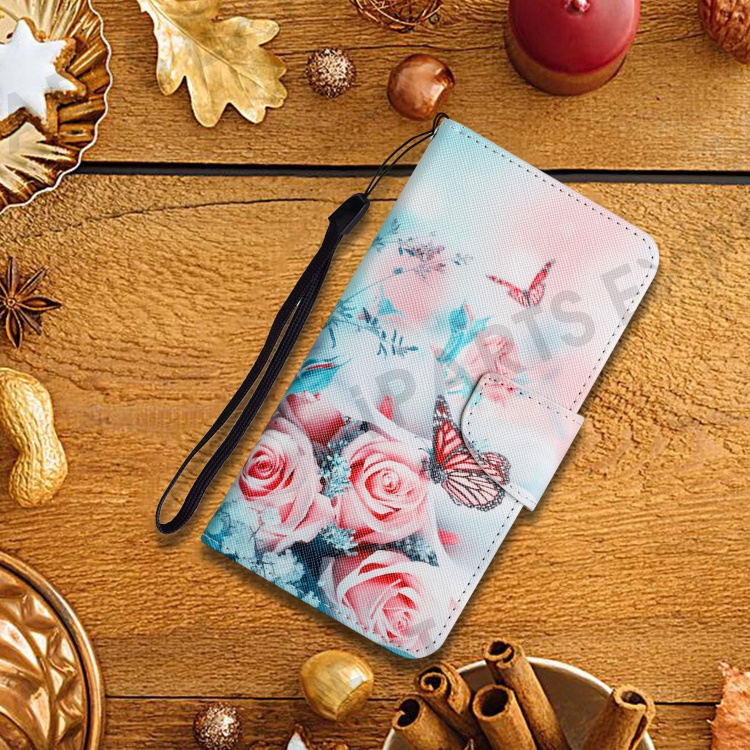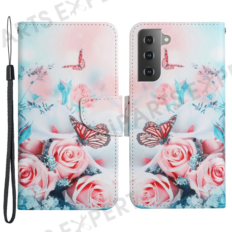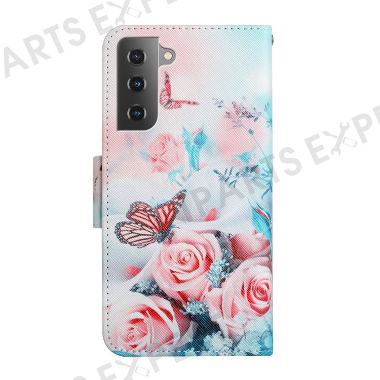 Pattern Printing All-round Protection Leather Phone Case Wallet Stand Cover Shell with Wrist Strap for Samsung Galaxy S22 5G - Rose