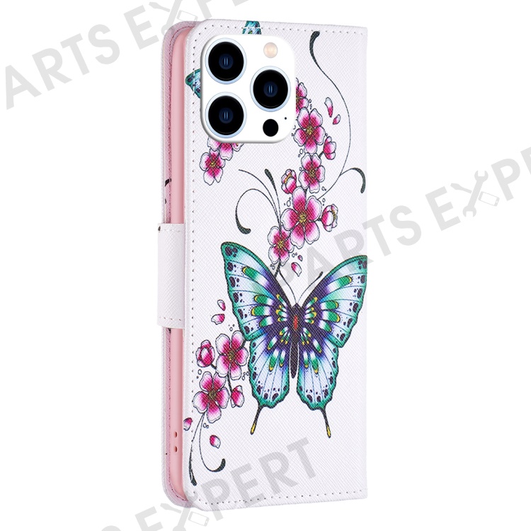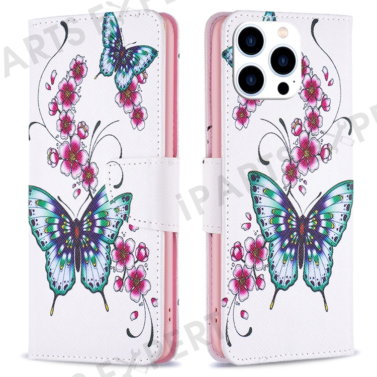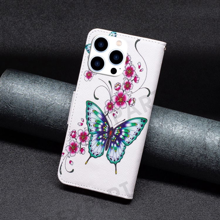 Pattern Printing Leather Case for iPhone 15 Pro Max , Stand Wallet Anti-drop Phone Cover - Blossom and Butterflies