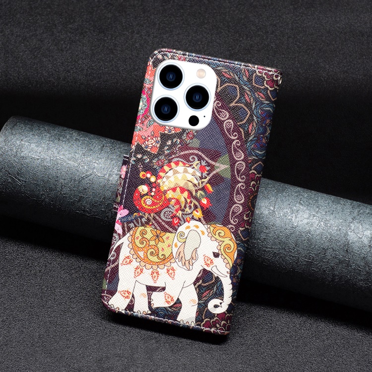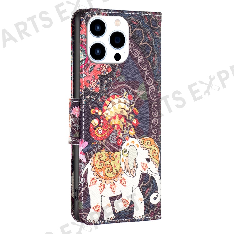 Pattern Printing Leather Case for iPhone 15 Pro Max , Stand Wallet Anti-drop Phone Cover - Flower and Elephant