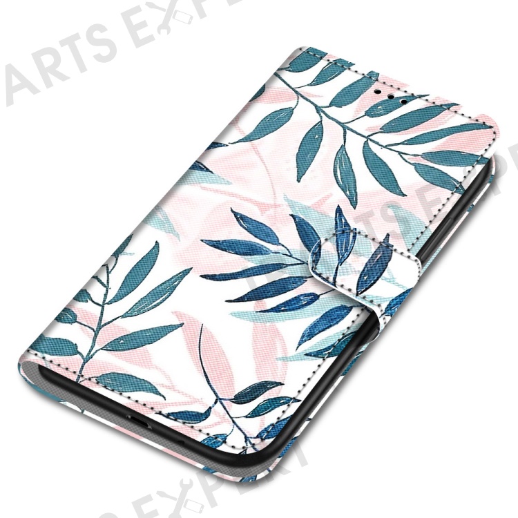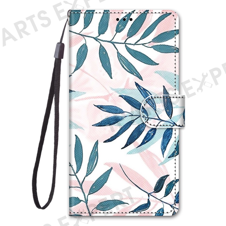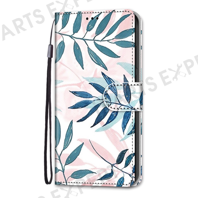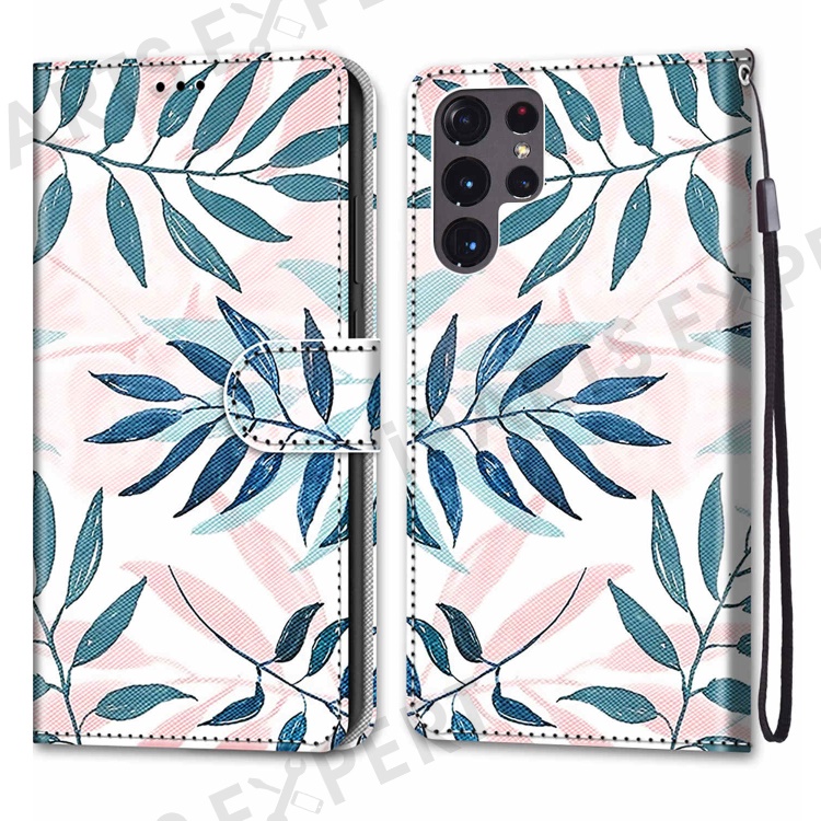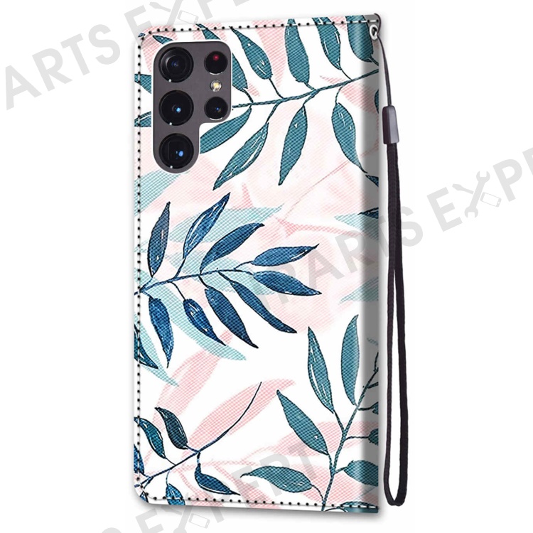 Pattern Printing Phone Case PU Leather + TPU Phone Cover with Stand Wallet and Wrist Strap for Samsung Galaxy S22 Ultra 5G - B06 Leaves