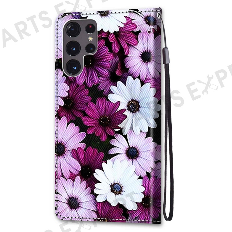 Pattern Printing Phone Case PU Leather + TPU Phone Cover with Stand Wallet and Wrist Strap for Samsung Galaxy S22 Ultra 5G - B13 Chrysanthemum