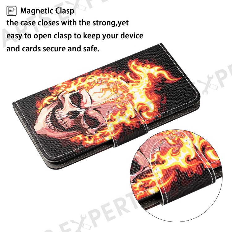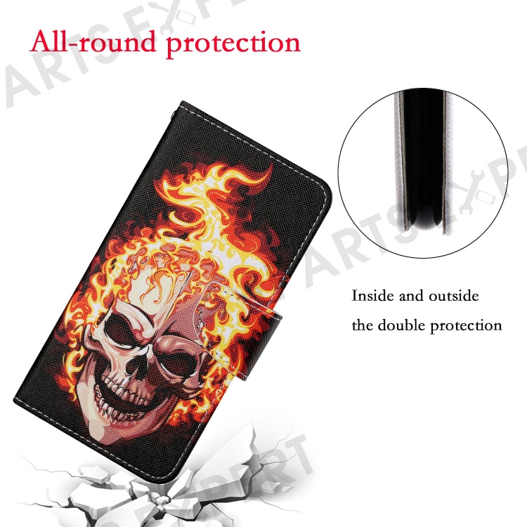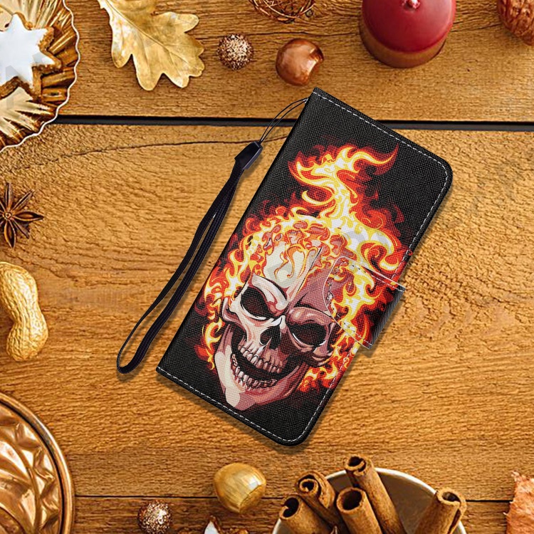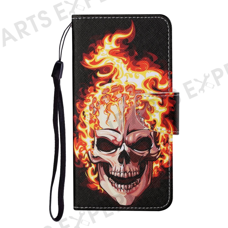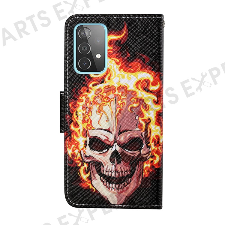 Pattern Printing Wallet Stand PU Leather Phone Cover Shell with Lanyard for Samsung Galaxy A52 4G/5G / A52s 5G - Flame Skull