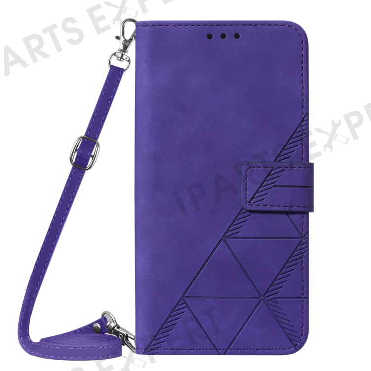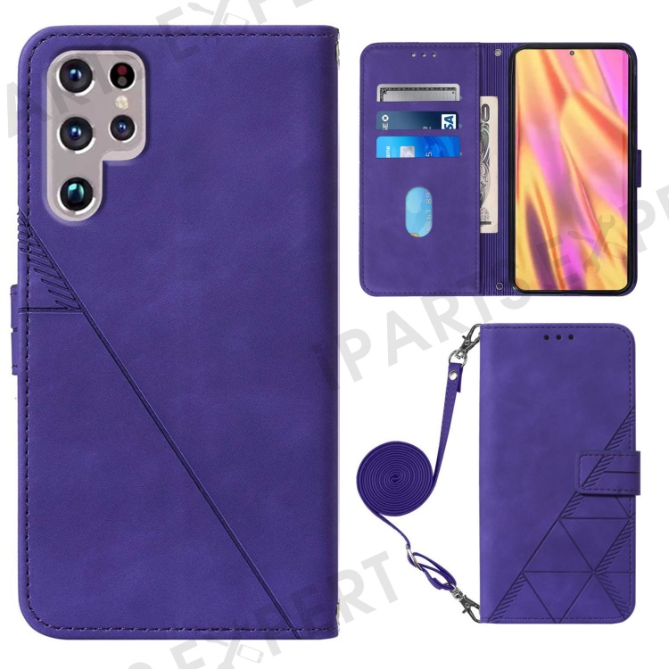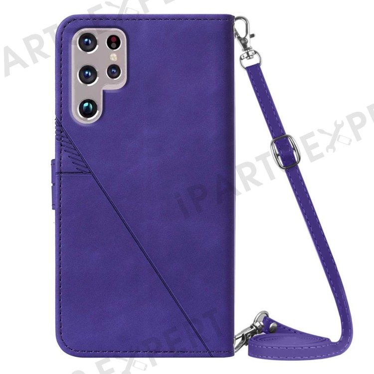PB2-1 Series Imprinting Lines PU Leather Hands-free Stand Wallet Phone Cover Magnetic Clasp Case with Shoulder Strap for Samsung Galaxy S22 Ultra 5G - Purple