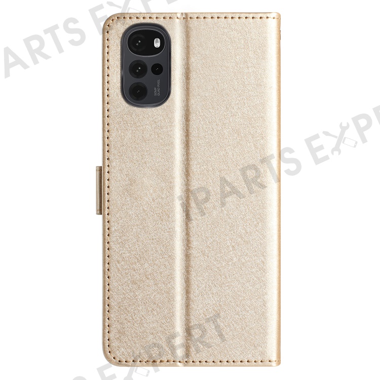 Phone Stand Cover for Motorola Moto G22 Silk Texture PU Leather Wallet Case with Hand Strap - Gold