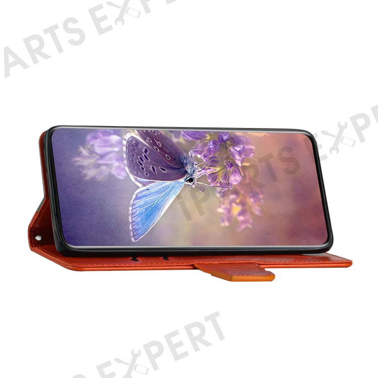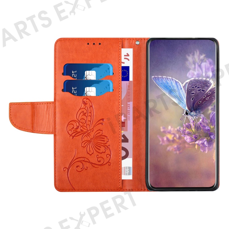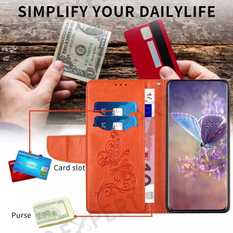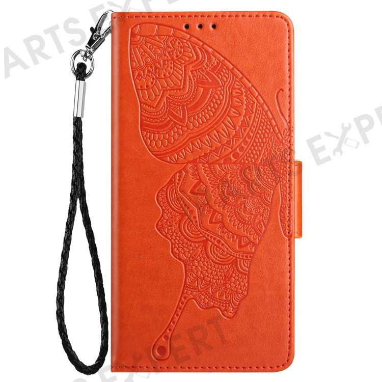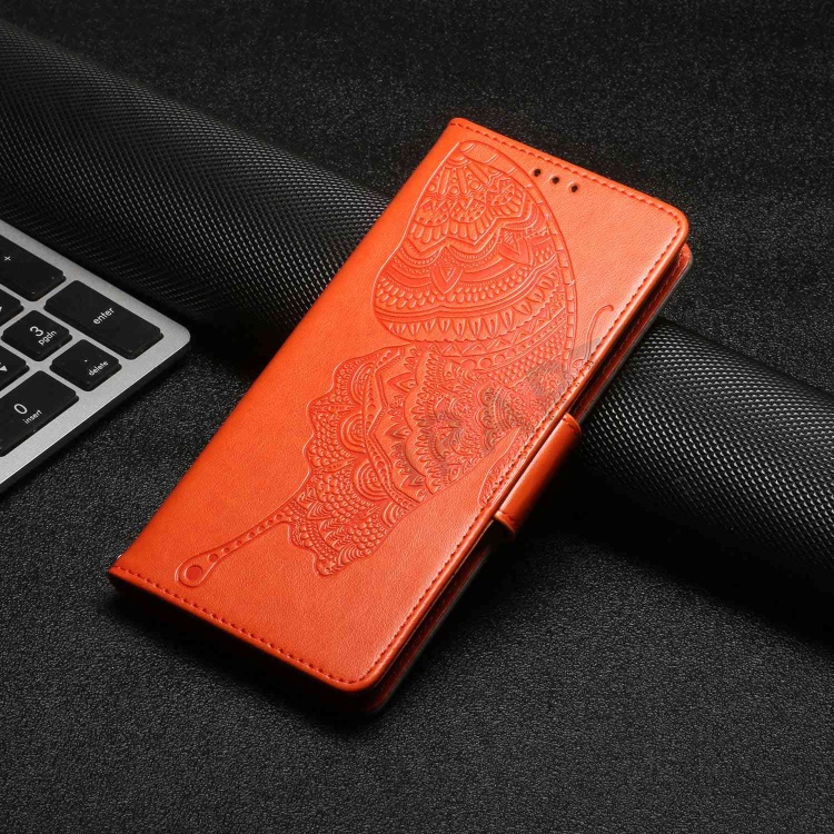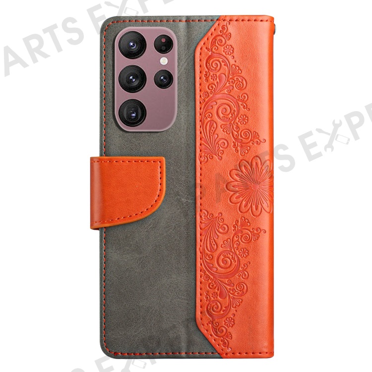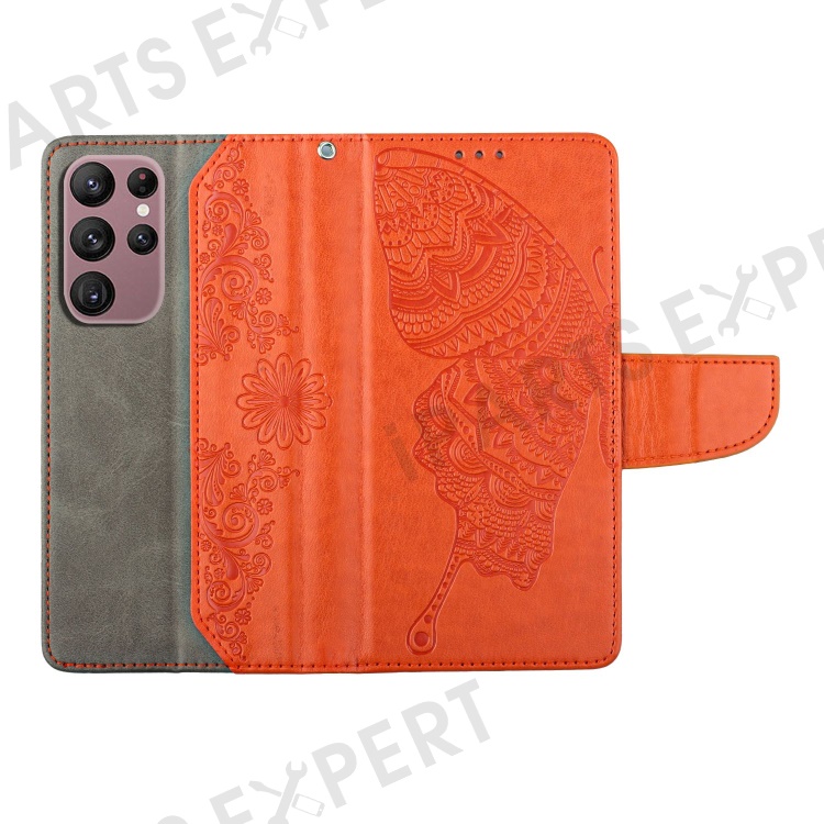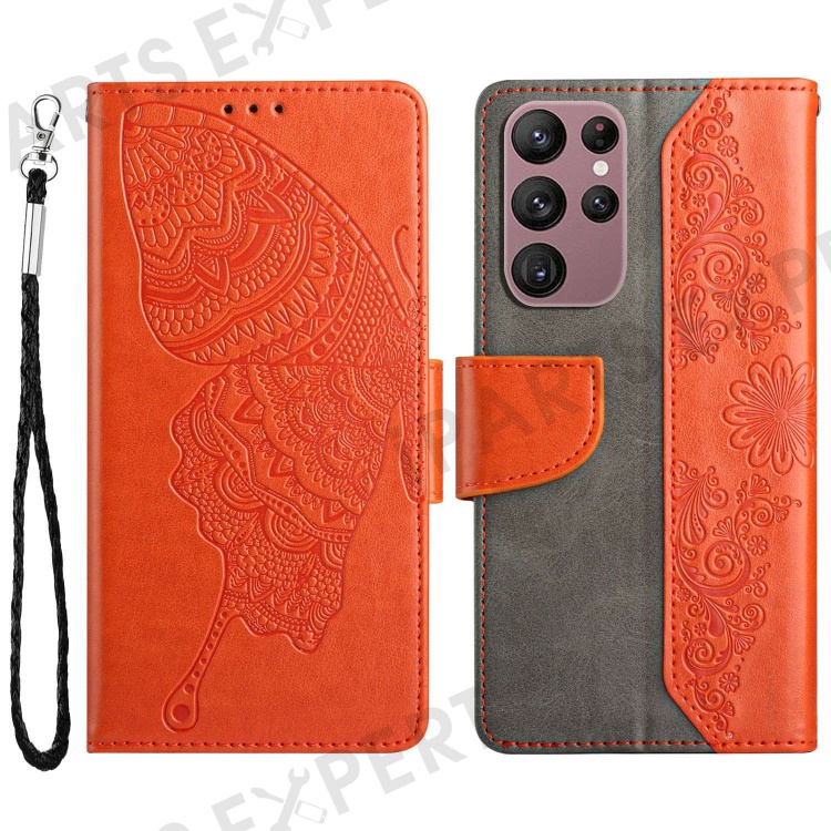 PU Leather Phone Case for Samsung Galaxy S23 Ultra, Butterfly Flower Imprinted Hands-free Stand Wallet Cover - Orange