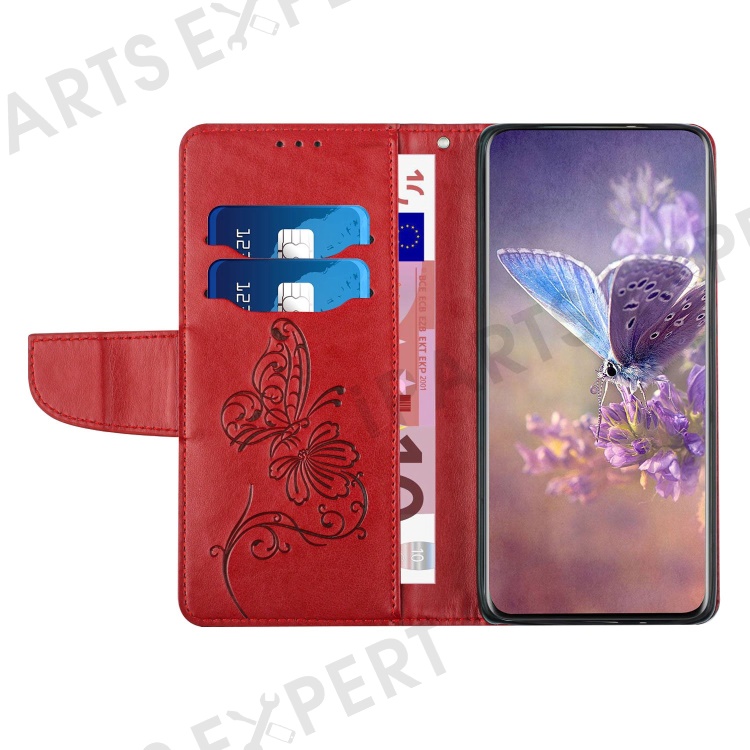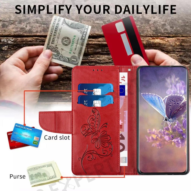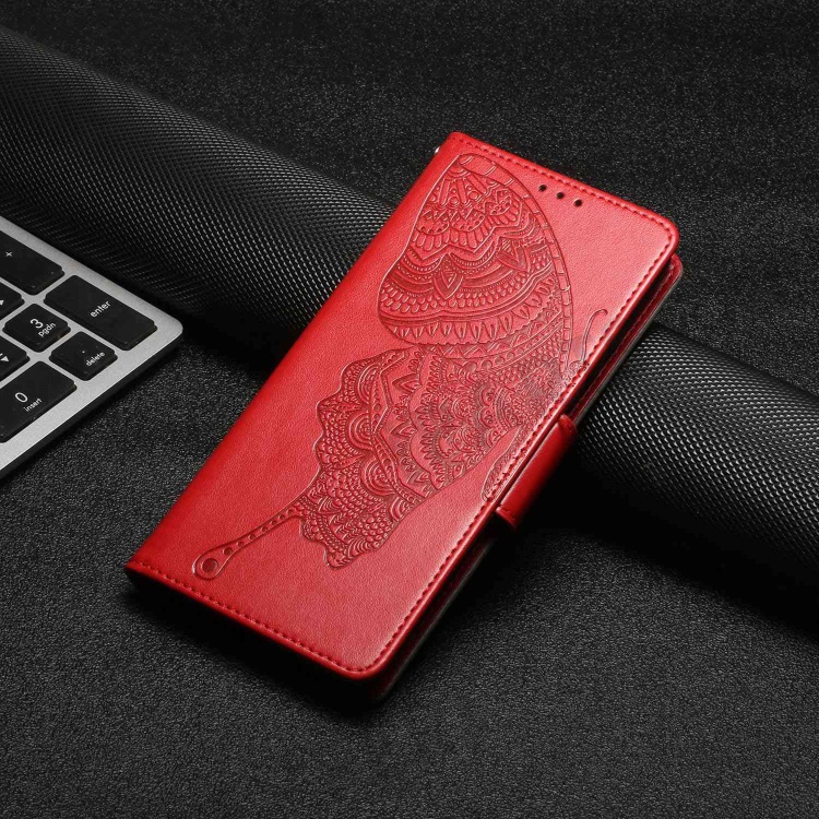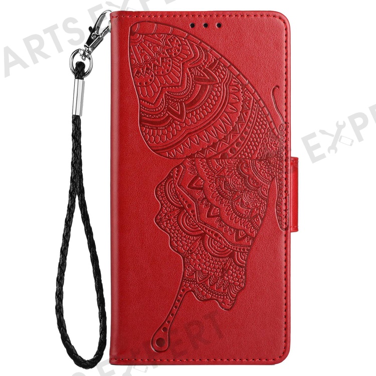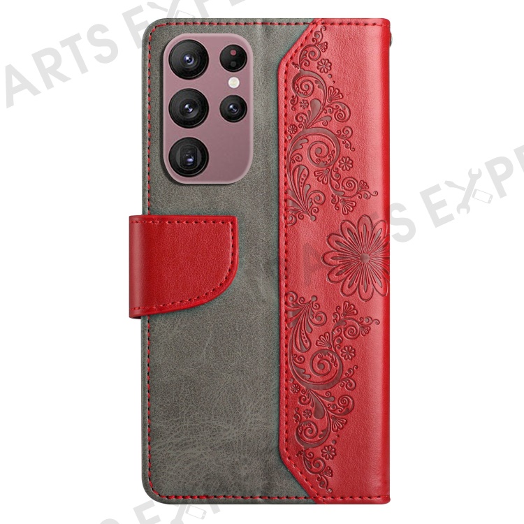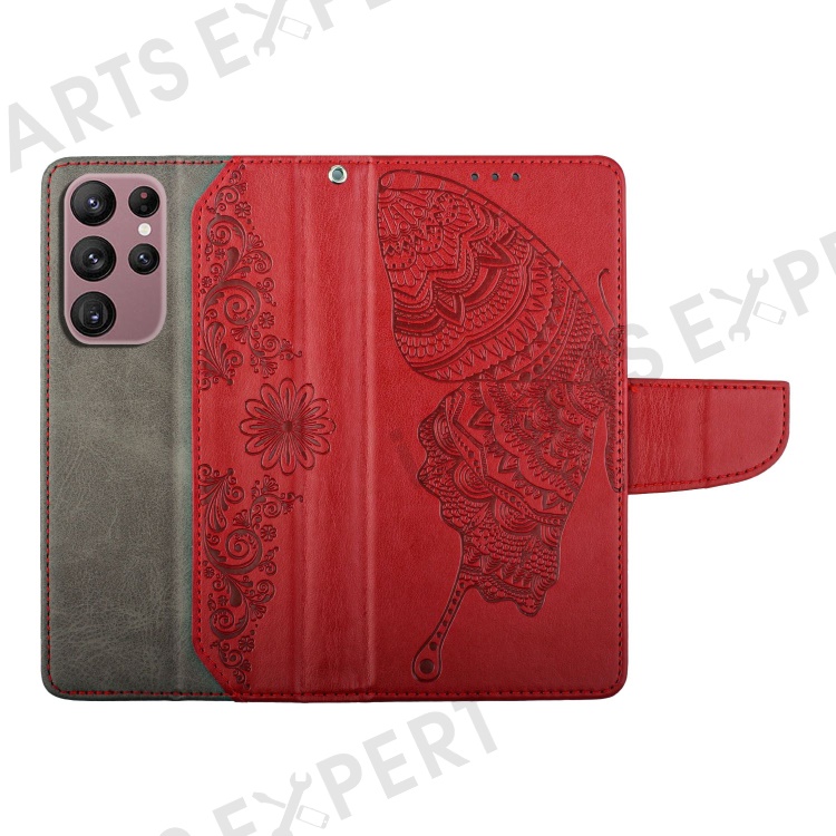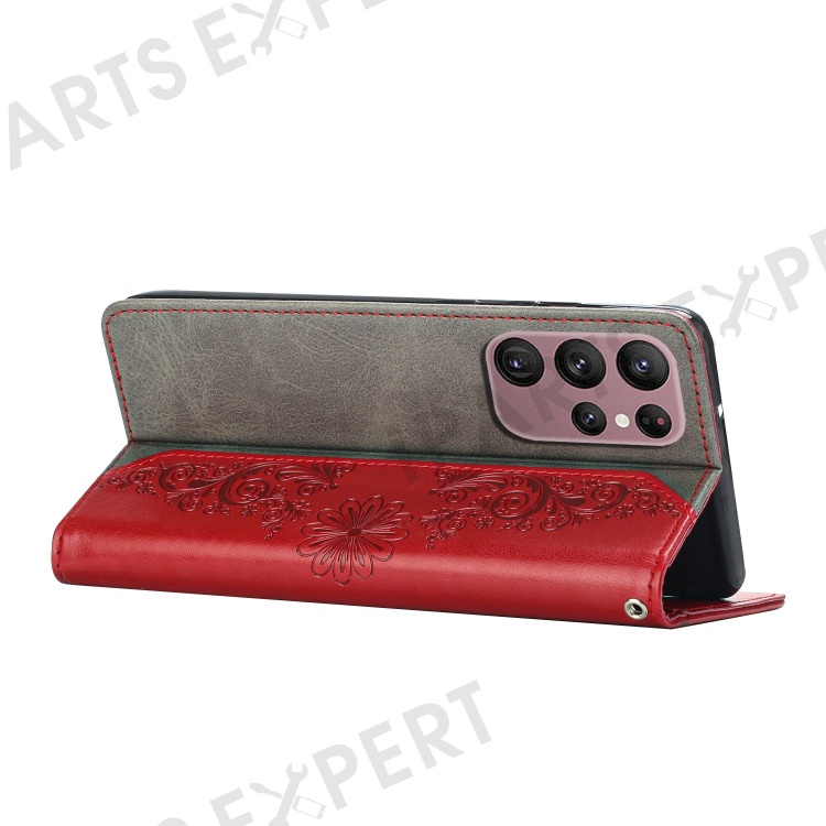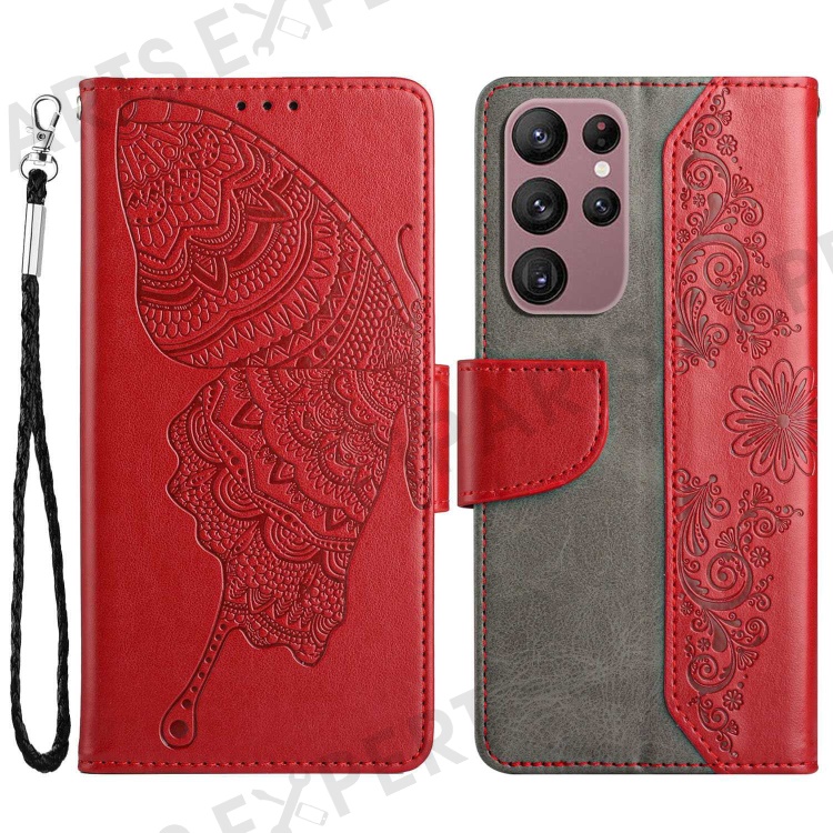 PU Leather Phone Case for Samsung Galaxy S23 Ultra, Butterfly Flower Imprinted Hands-free Stand Wallet Cover - Red
