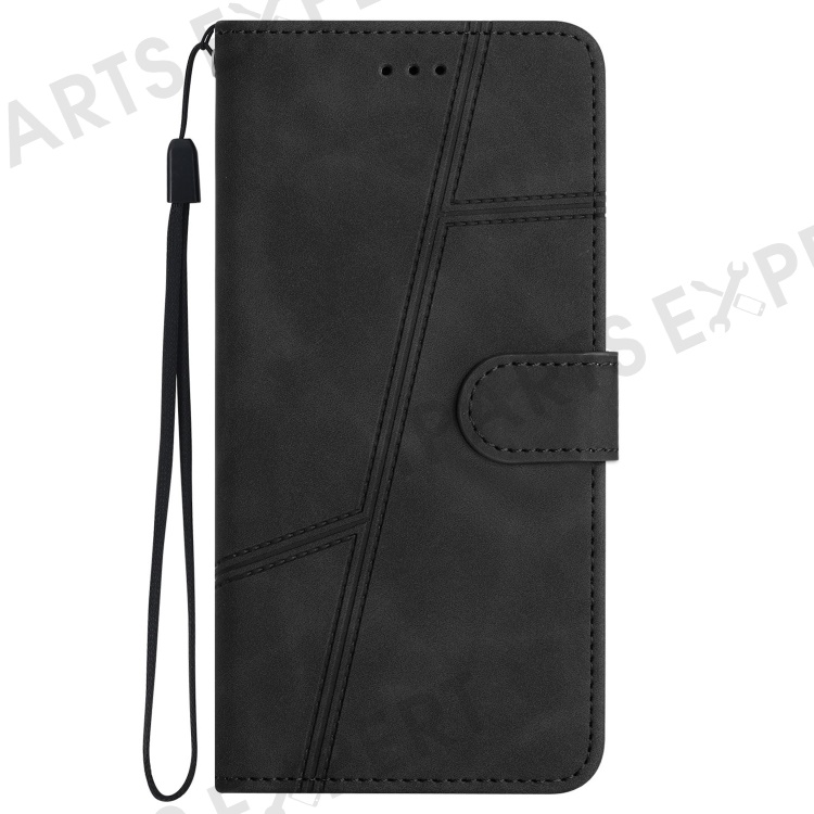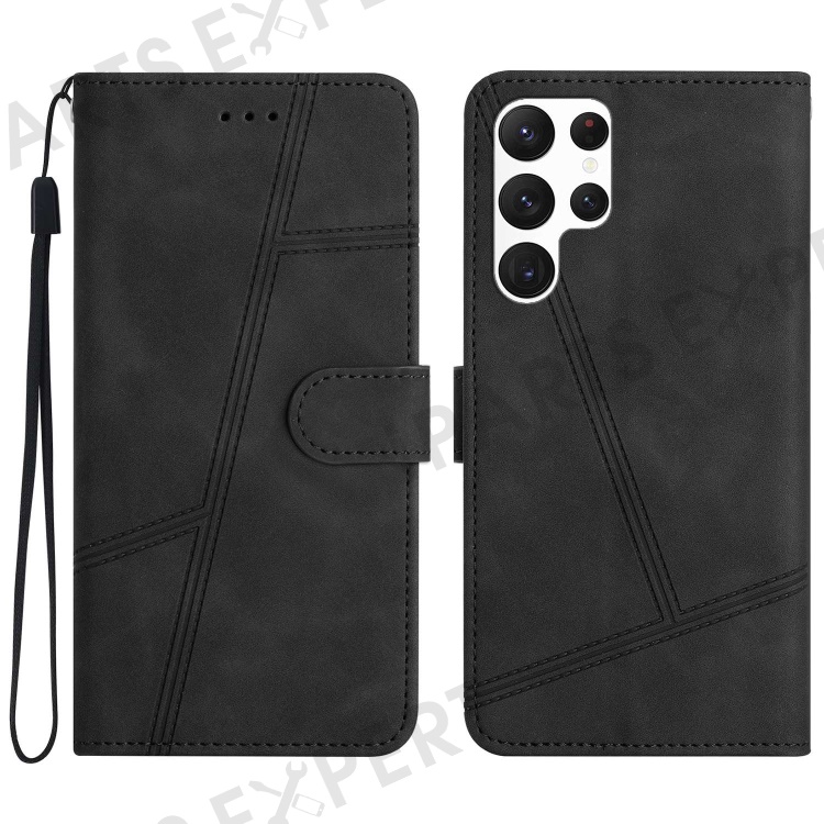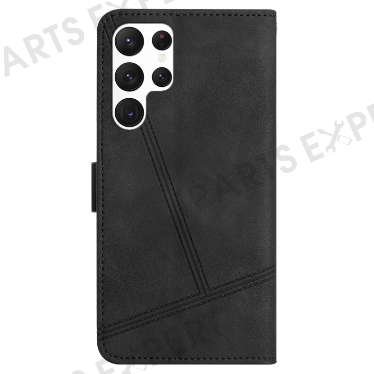 PU Leather Phone Cover for Samsung Galaxy S22 Ultra 5G, Skin-touch Feeling Lines Decor Retro Phone Case Stand Wallet - Black
