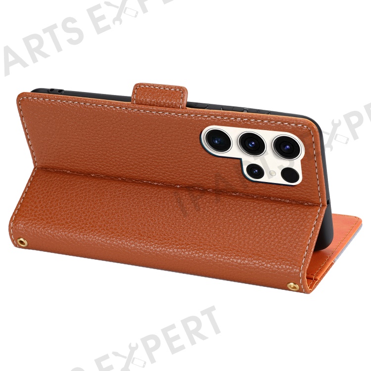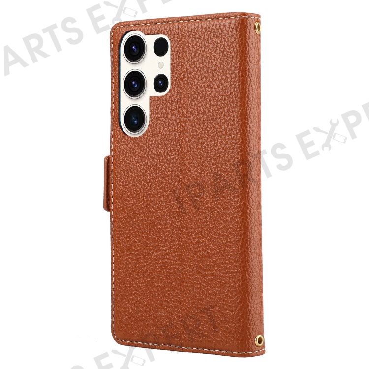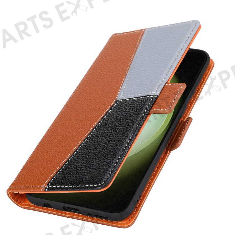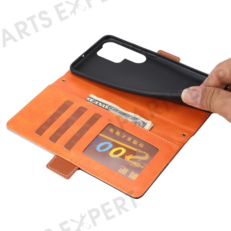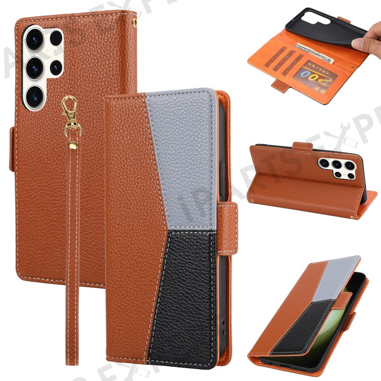PU Leather Phone Wallet Case for Samsung Galaxy S23 Ultra, Tri-color Splicing Litchi Texture Phone Stand Cover with Strap - Brown