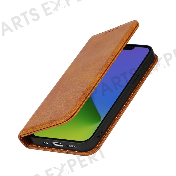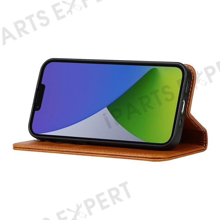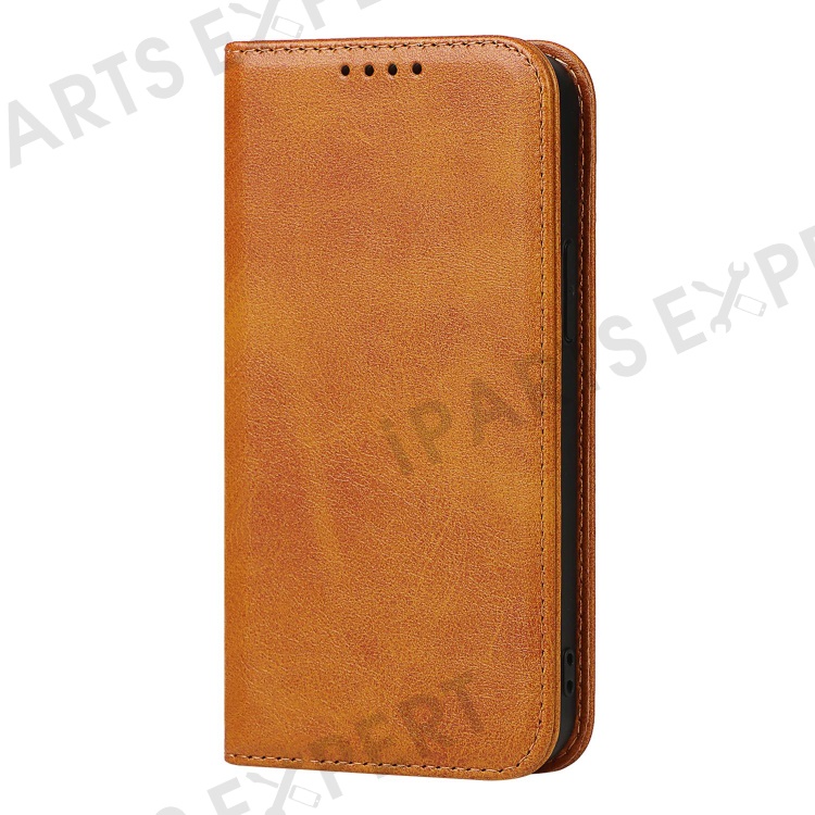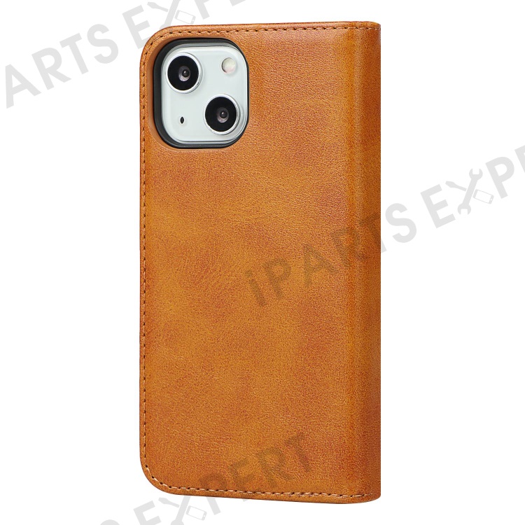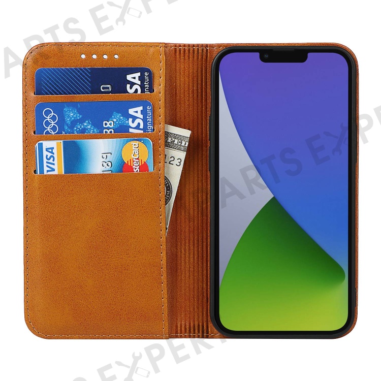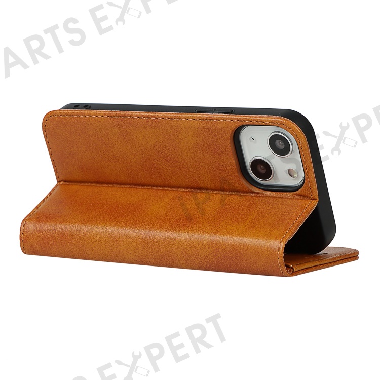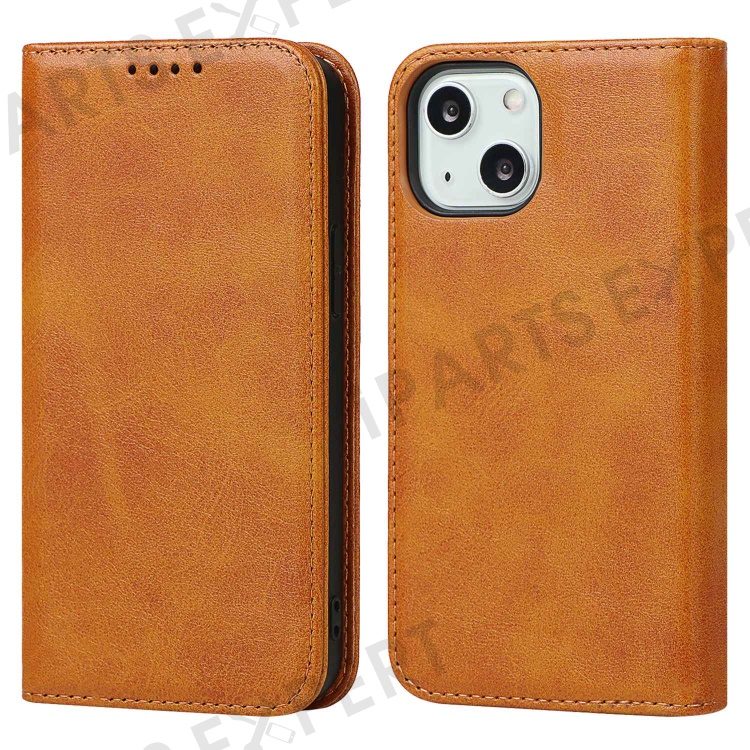 PU Leather Wallet Case for iPhone 14, Calf Texture Magnetic Auto Closing Shockproof Shell Phone Foldable Stand Cover - Light Brown