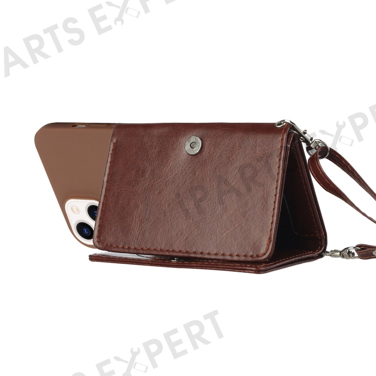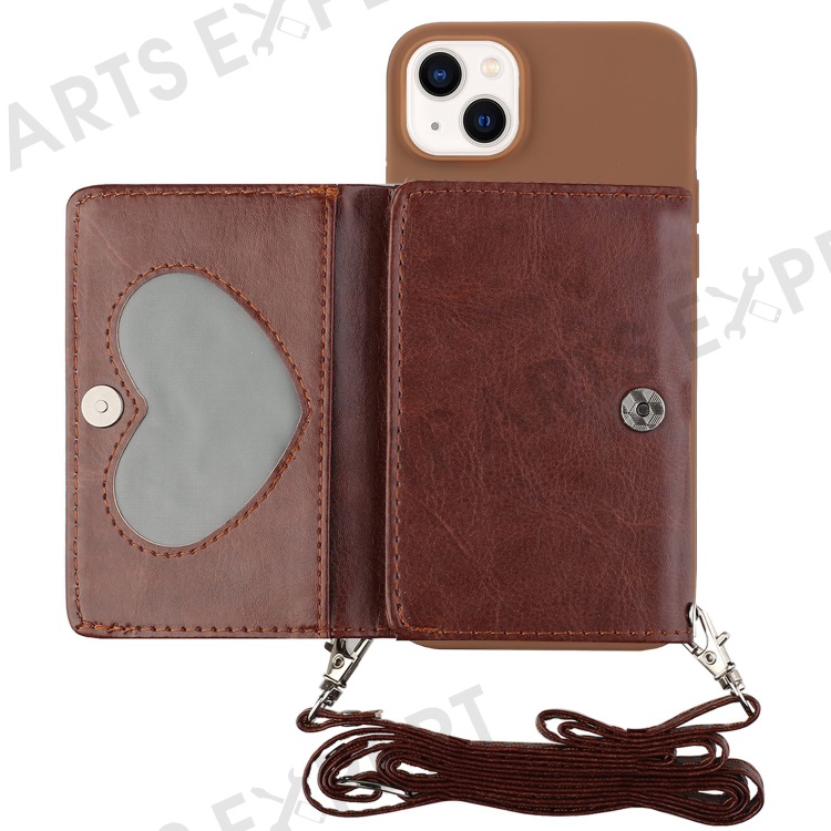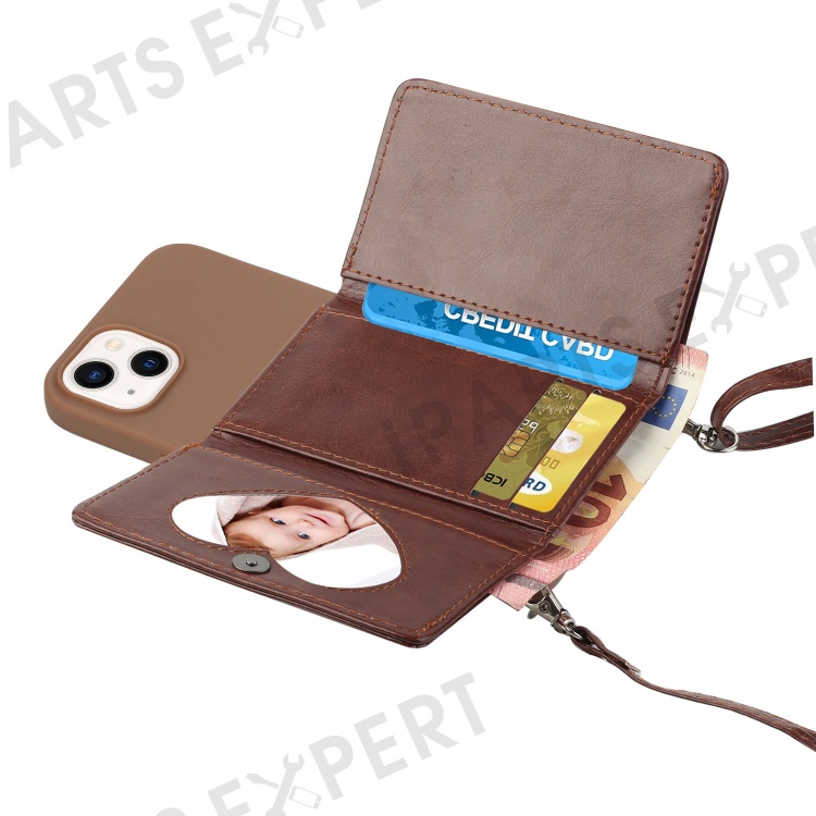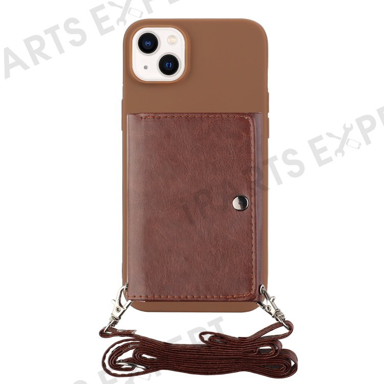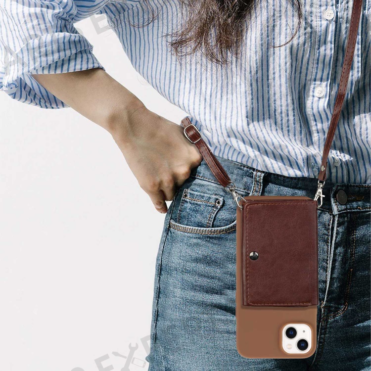 PU Leather Wallet Kickstand Case for iPhone 14 Plus, Drop-proof TPU Phone Cover with Shoulder Strap - Coffee