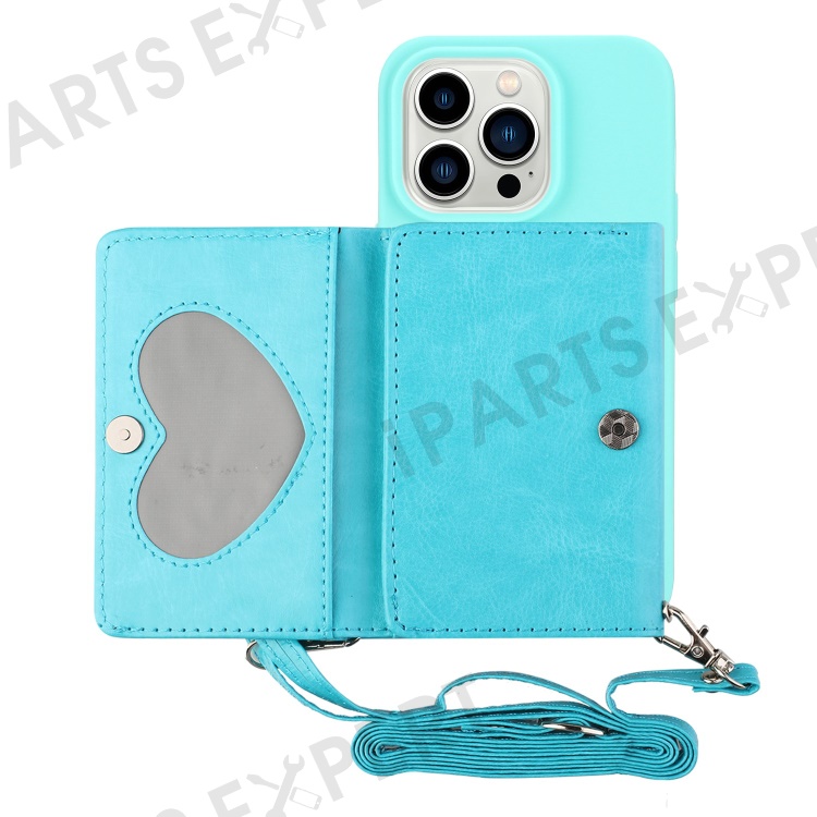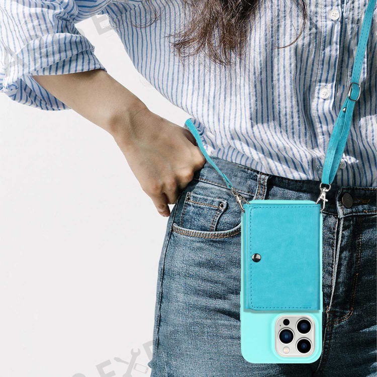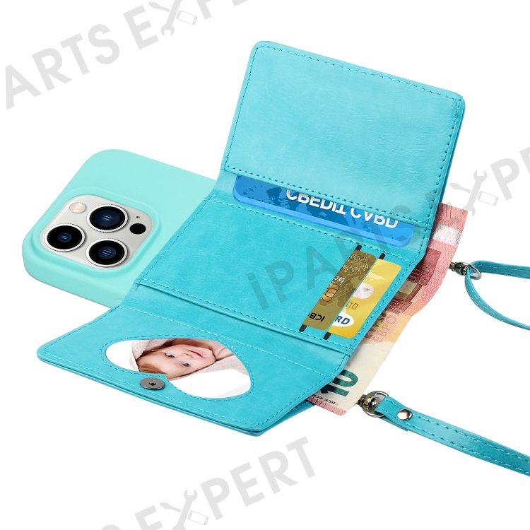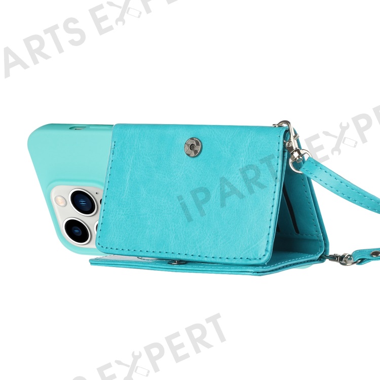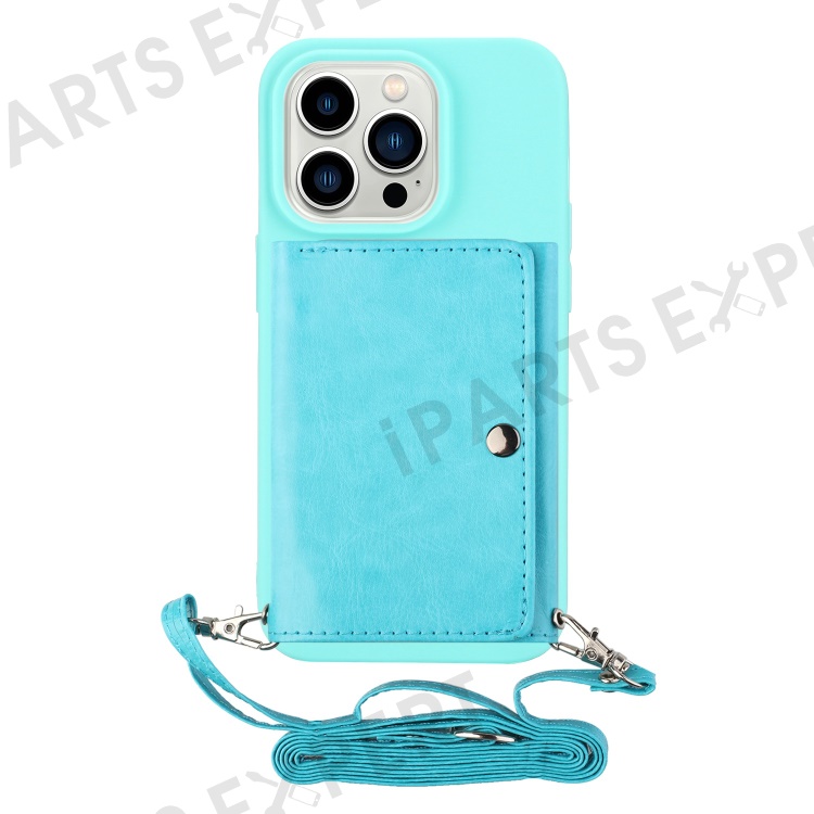 PU Leather Wallet TPU Case for iPhone 14 Pro, Kickstand Anti-scratch Phone Cover with Shoulder Strap - Baby Blue
