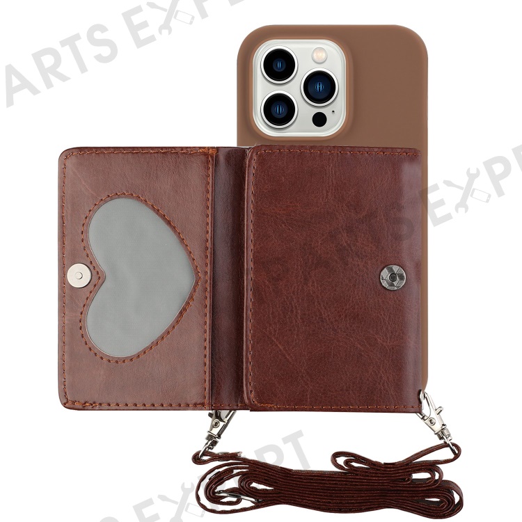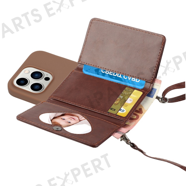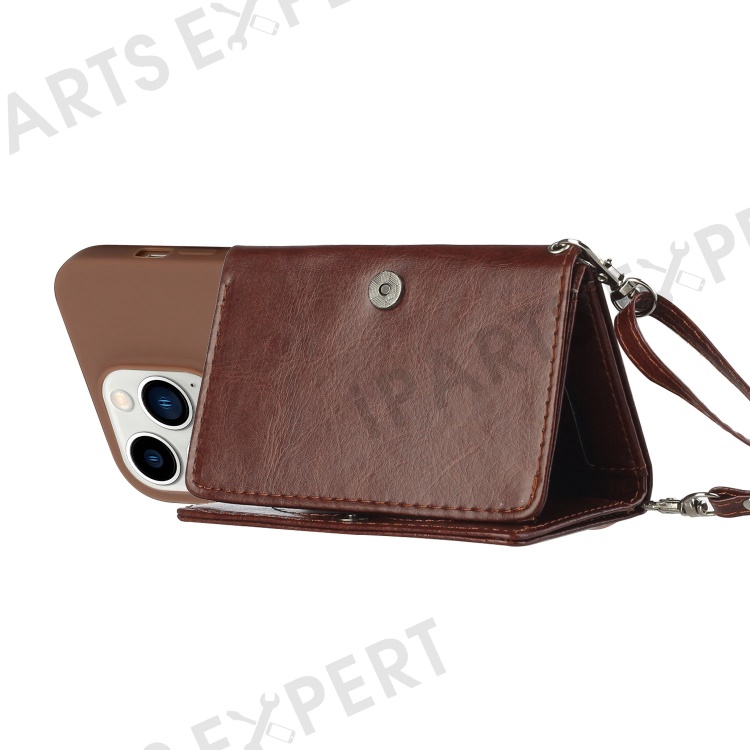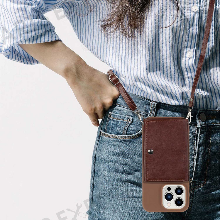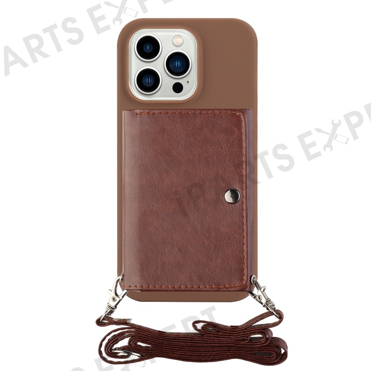PU Leather Wallet TPU Case for iPhone 14 Pro, Kickstand Anti-scratch Phone Cover with Shoulder Strap - Coffee
