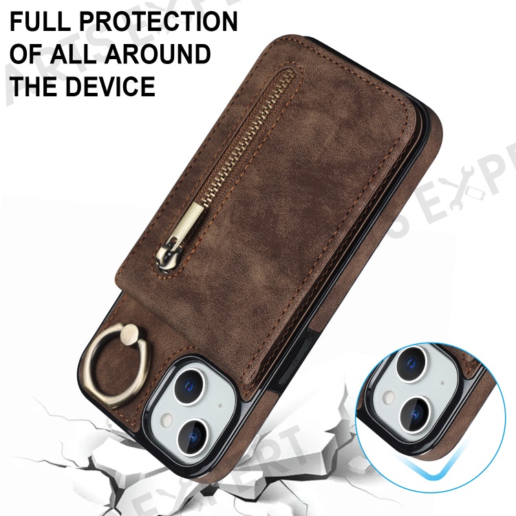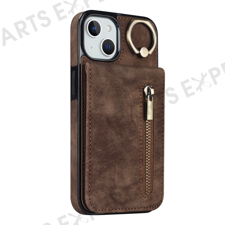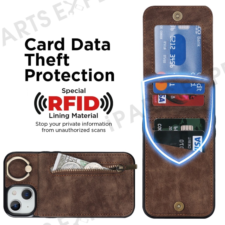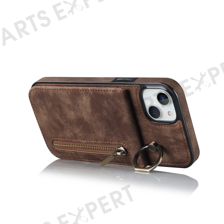 PU+TPU Cover for iPhone 13 mini , Ring Kickstand RFID Blocking Cell Phone Case - Brown