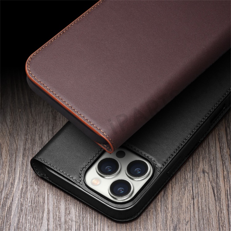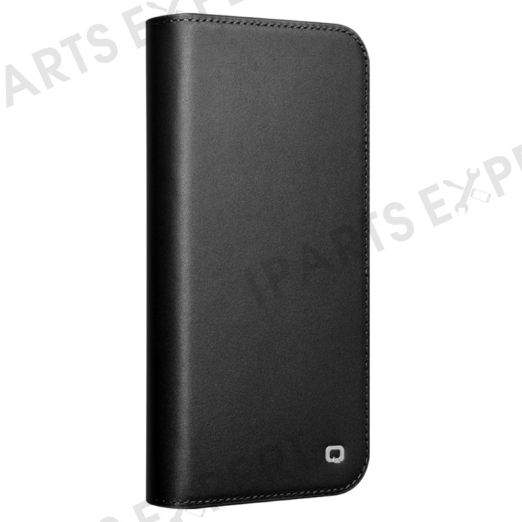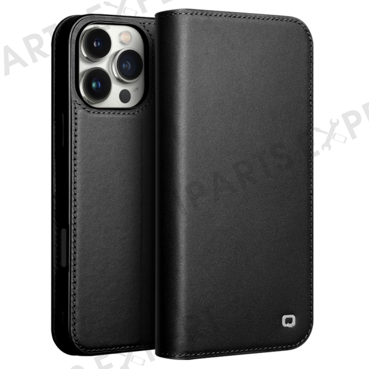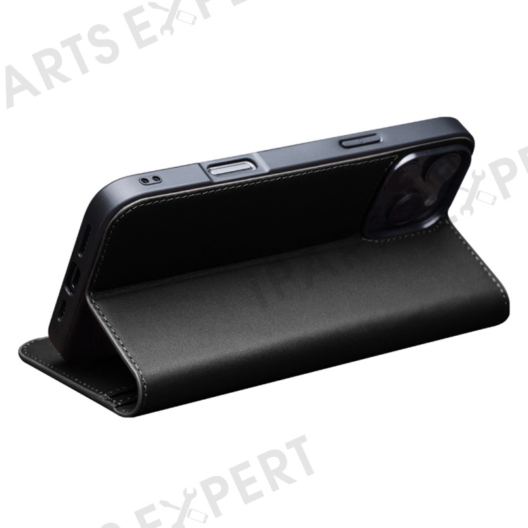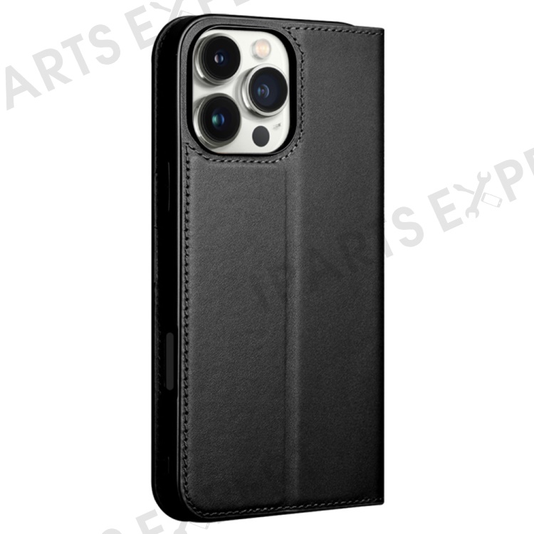 QIALINO For iPhone 16 Pro Max Stand Case Anti-Drop Genuine Cow Leather Wallet Phone Cover - Black
