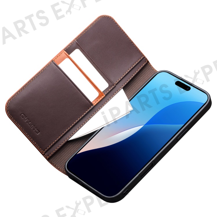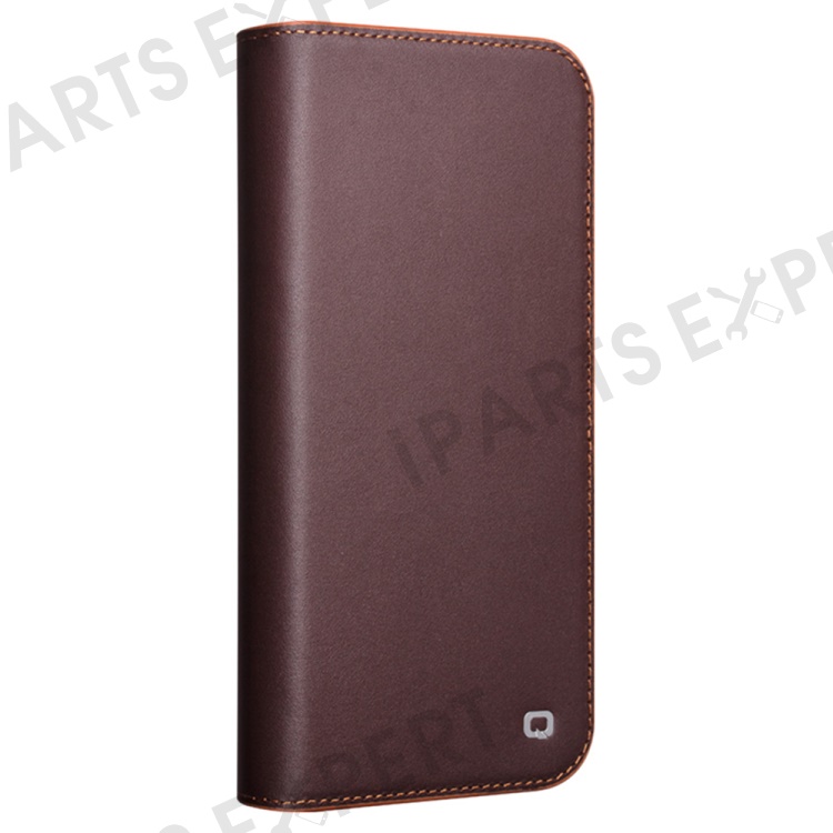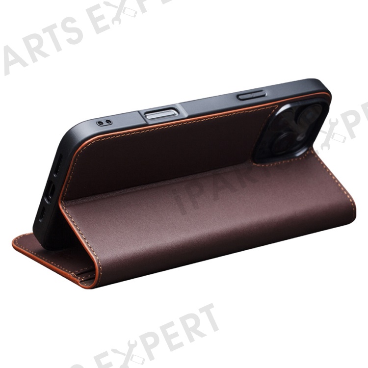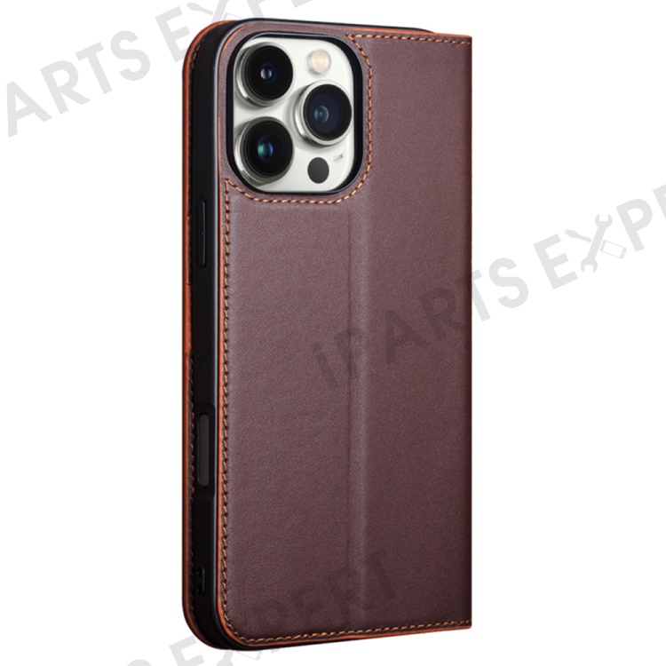 QIALINO For iPhone 16 Pro Stand Case Anti-Drop Genuine Cow Leather Wallet Phone Cover - Brown