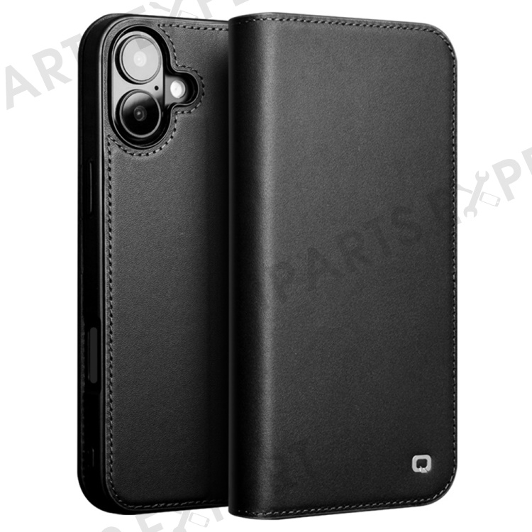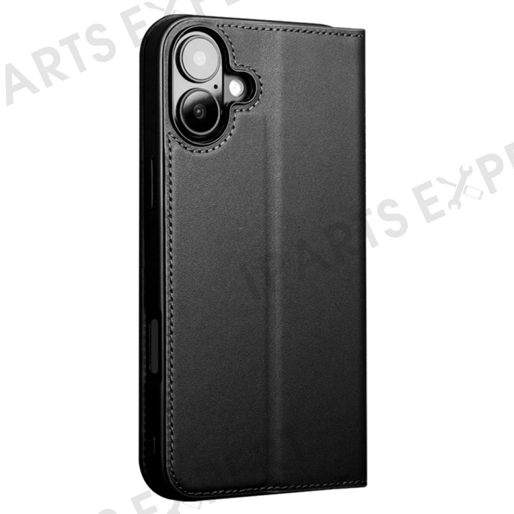 QIALINO For iPhone 16 Stand Case Anti-Drop Genuine Cow Leather Wallet Phone Cover - Black