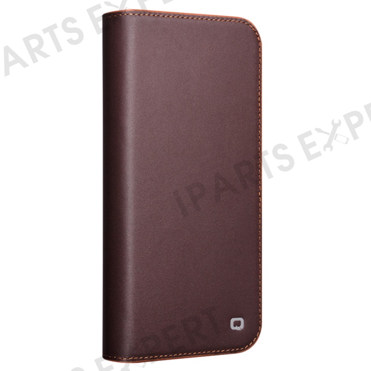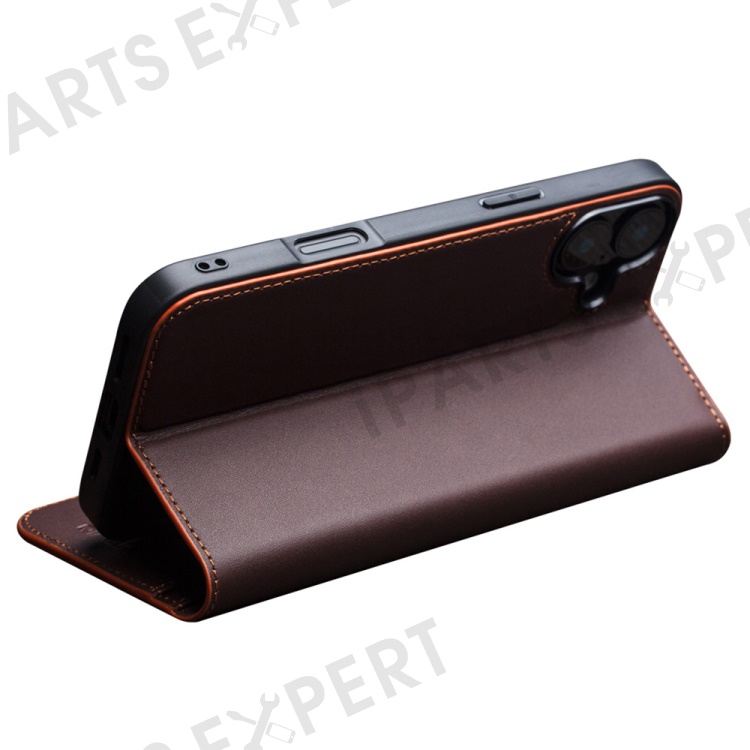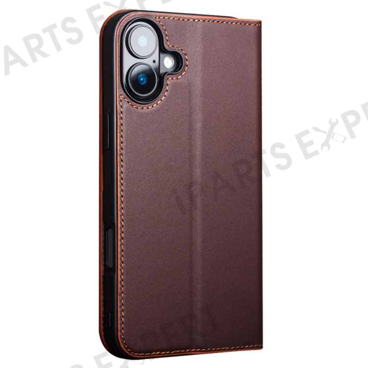 QIALINO For iPhone 16 Stand Case Anti-Drop Genuine Cow Leather Wallet Phone Cover - Brown