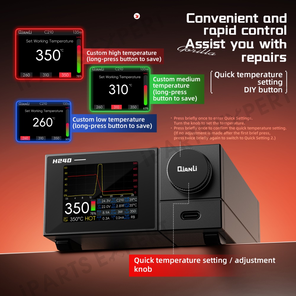 - 【240W High-Power Performance】Equipped with a powerful 240W power supply, the H240 smart soldering station delivers strong and stable output for fast heating and heavy-duty soldering tasks.