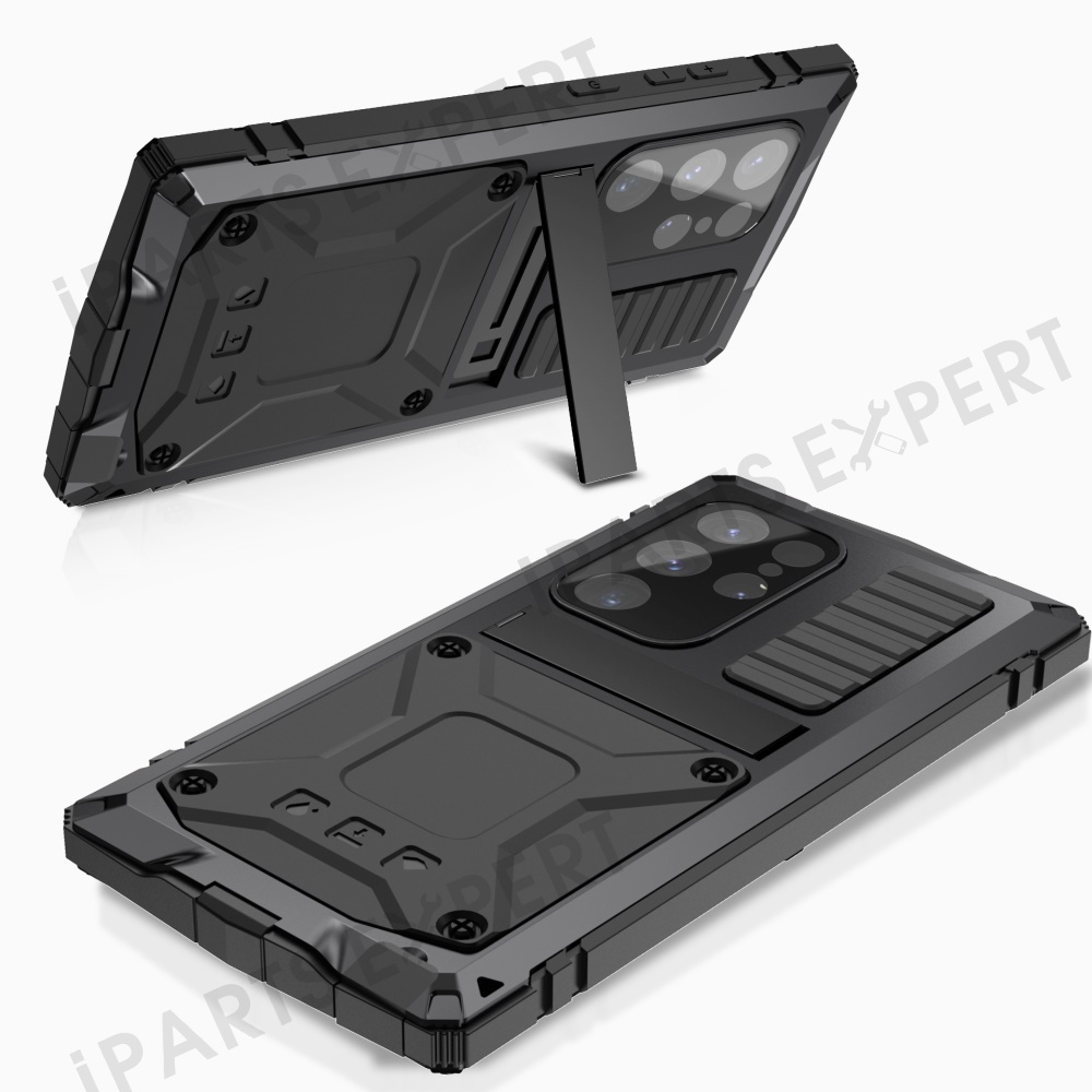 R-JUST For Samsung Galaxy S25 Ultra Case PC + Silicone + Metal Kickstand Phone Cover with Tempered Glass Film - Black