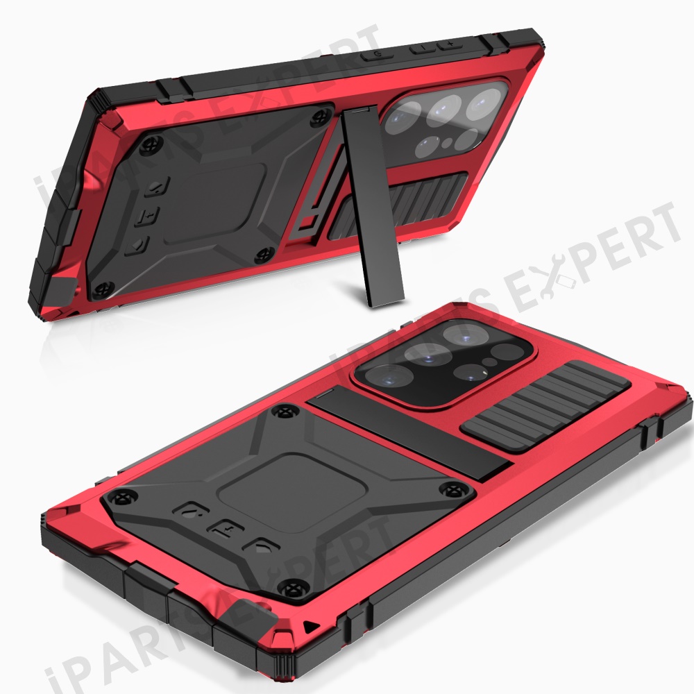 R-JUST For Samsung Galaxy S25 Ultra Case PC + Silicone + Metal Kickstand Phone Cover with Tempered Glass Film - Red