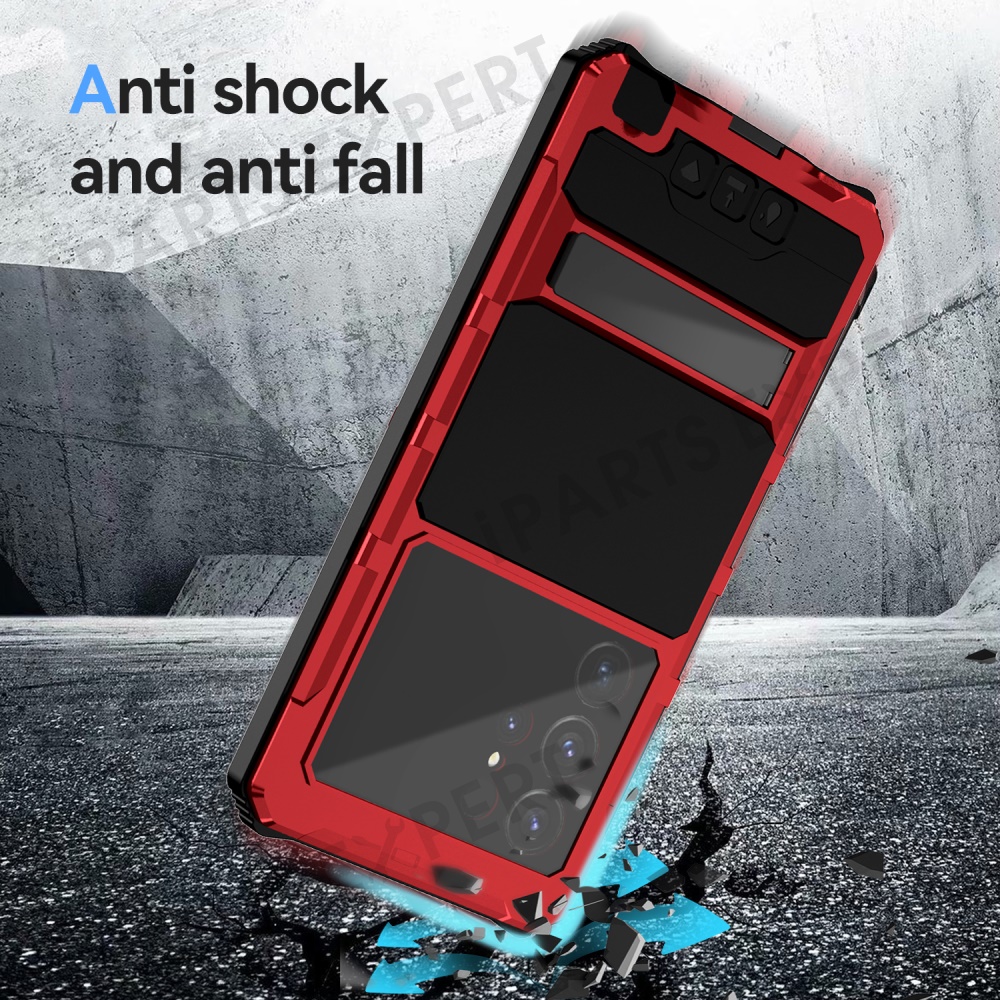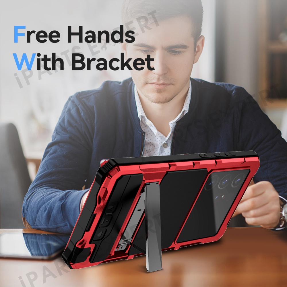 R-JUST For Samsung Galaxy S25 Ultra Case PC + Silicone + Metal Kickstand Phone Cover with Tempered Glass Film - Red