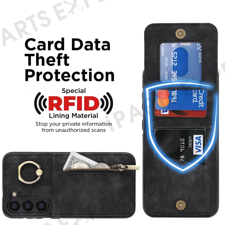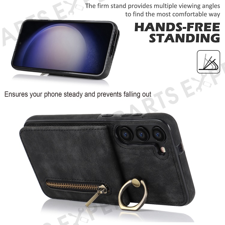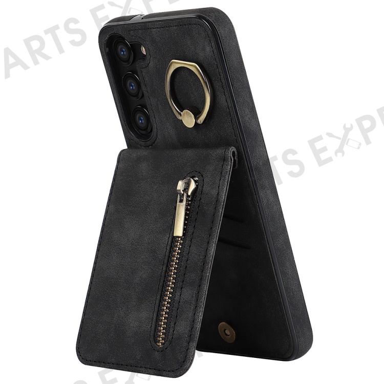 RFID Blocking Kickstand Phone Case for Samsung Galaxy S23+ Retro PU+TPU Zippered Wallet Phone Cover - Black