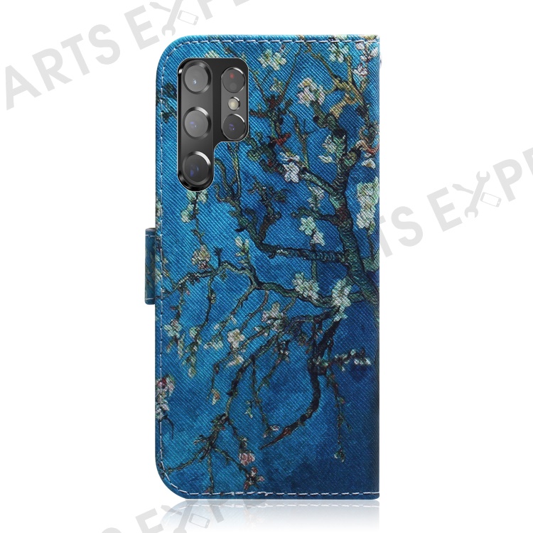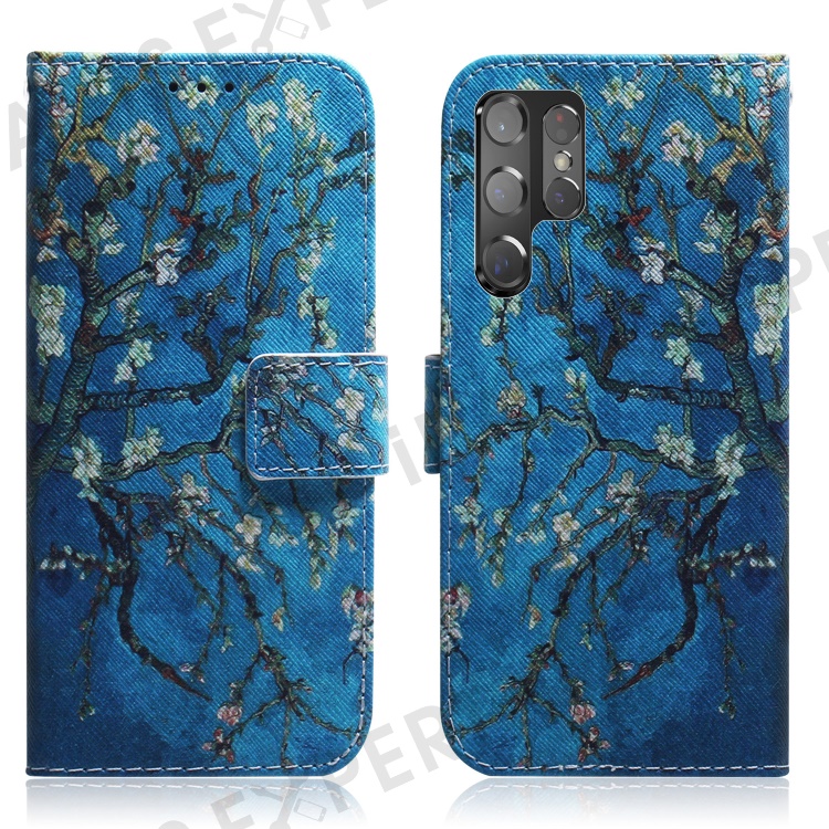 Shockproof Pattern Printing Stand Flip Magnetic Closure Protection PU Leather Wallet Case Cover for Samsung Galaxy S22 Ultra 5G - Apricot Flowers