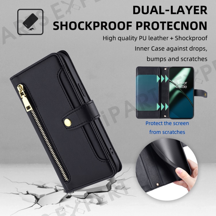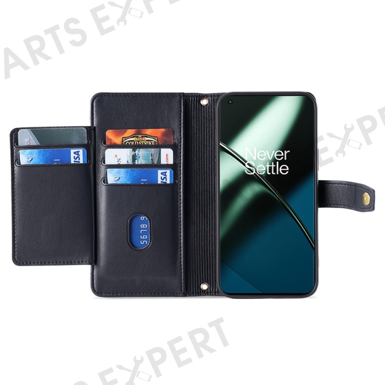 Shockproof Phone Case for OnePlus 11 5G, Zipper Pocket Card Slots Flip Leather Phone Cover with Straps - Black