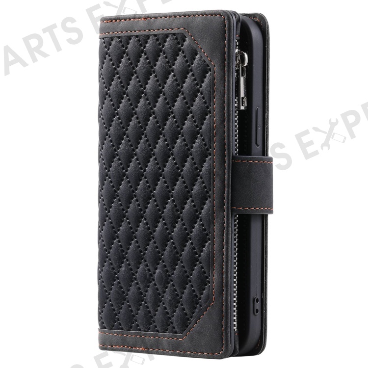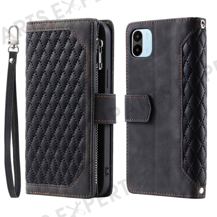 Shockproof Phone Case For Xiaomi Redmi A1 4G, 005 Style Magnetic Handbag Rhombus Imprinted Zipper Pocket Flip Leather Wallet Stand Cover with Wrist Strap - Black