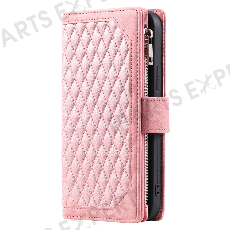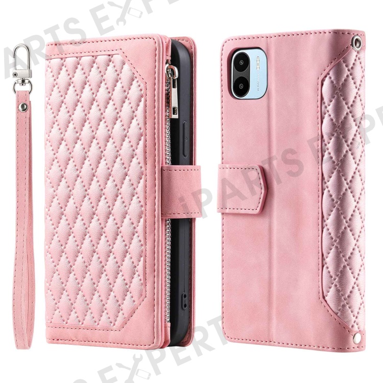Shockproof Phone Case For Xiaomi Redmi A1 4G, 005 Style Magnetic Handbag Rhombus Imprinted Zipper Pocket Flip Leather Wallet Stand Cover with Wrist Strap - Rose Gold