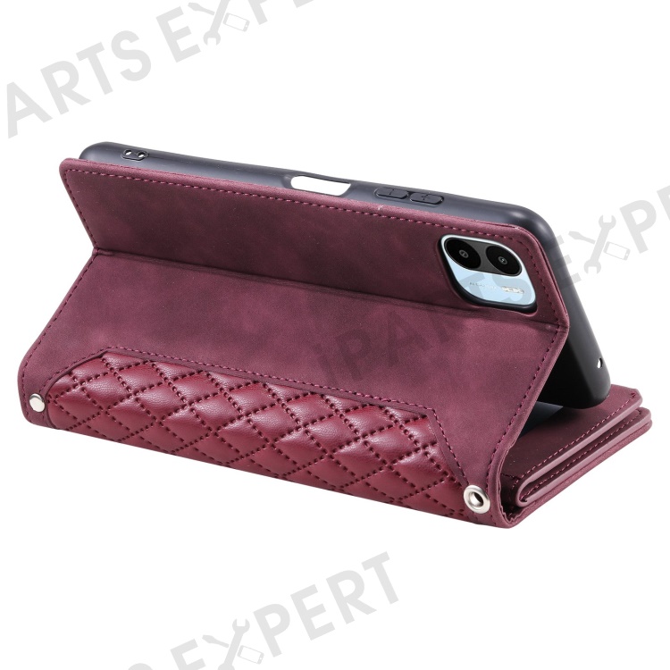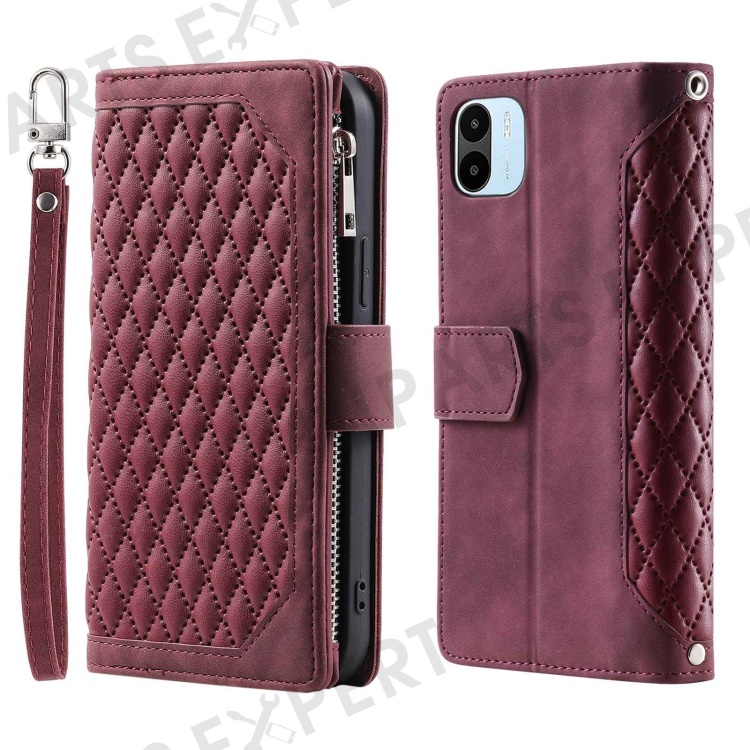 Shockproof Phone Case For Xiaomi Redmi A1 4G, 005 Style Magnetic Handbag Rhombus Imprinted Zipper Pocket Flip Leather Wallet Stand Cover with Wrist Strap - Wine Red