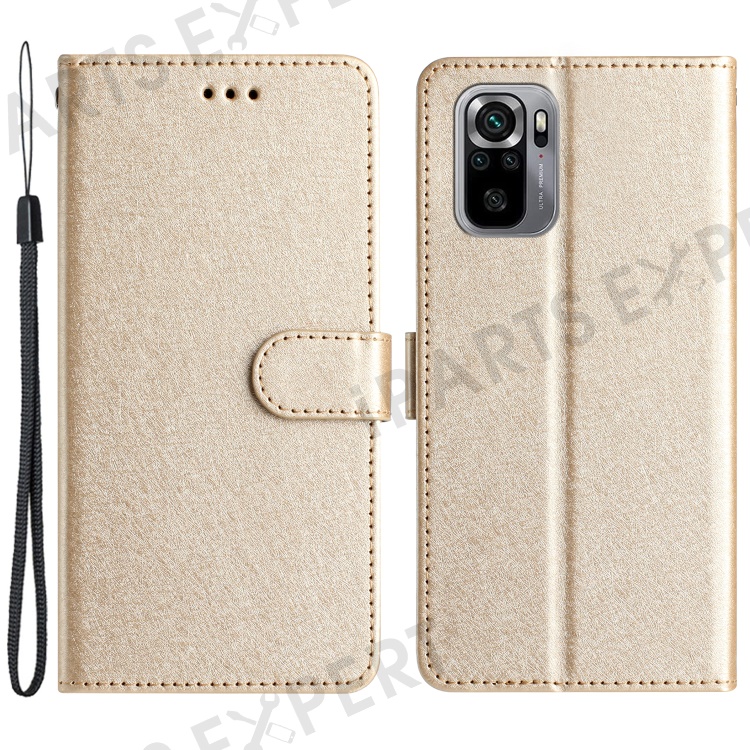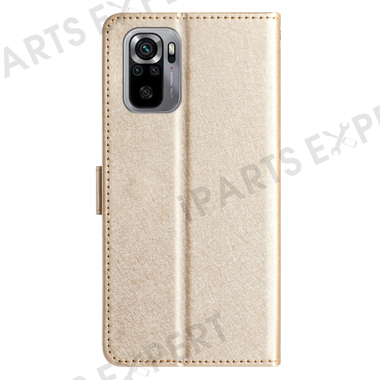 Silk Texture Case for Xiaomi Redmi Note 10 4G / 10S 4G / Poco M5s 4G Leather Wallet Stand Shell with Hand Strap - Gold