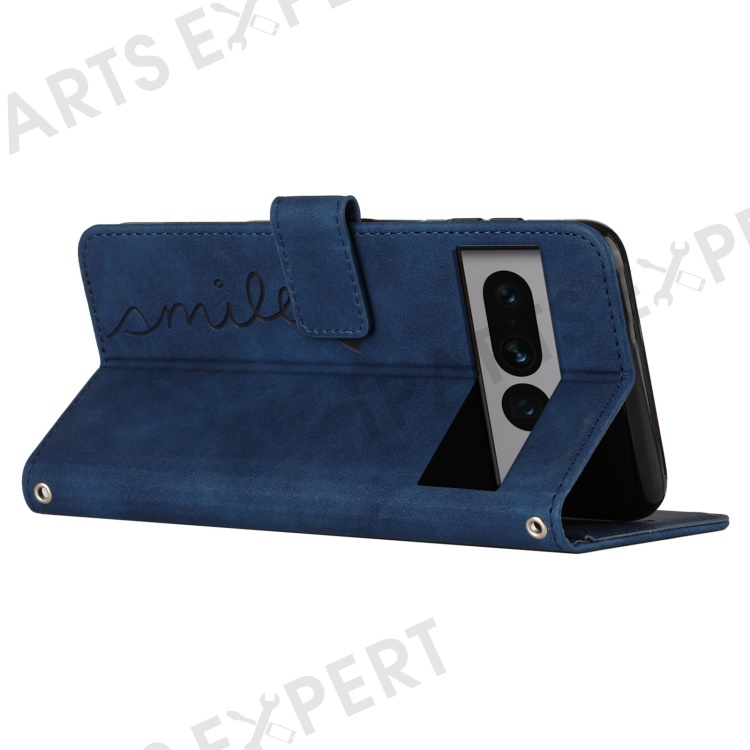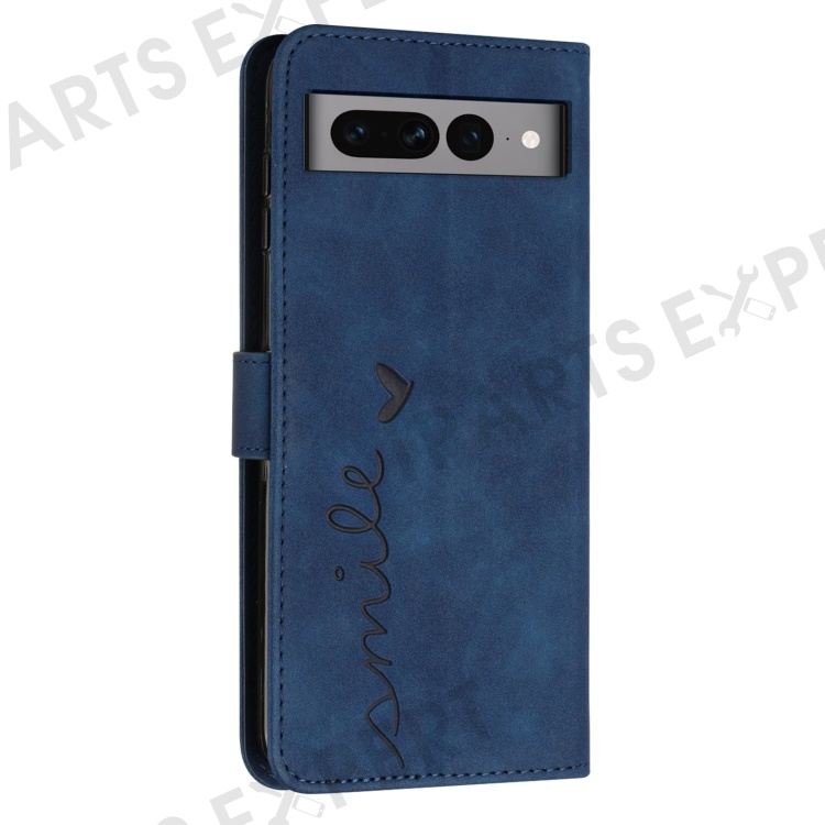 Skin-touch Feeling Case for Google Pixel 7 Pro 5G, Drop Resistant Heart Shape Imprinted Wallet Stand PU Leather Phone Cover with Shoulder Strap - Sapphire