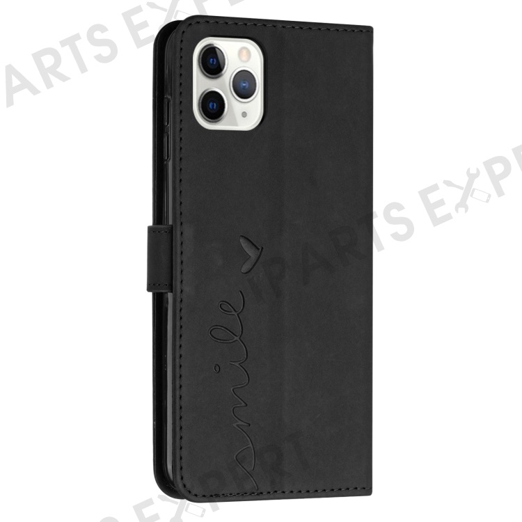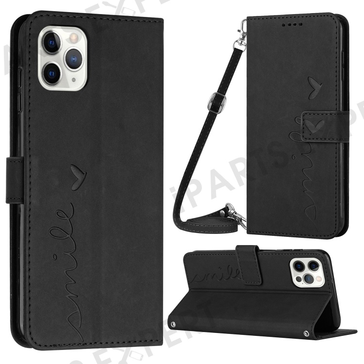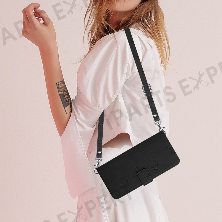Skin-touch Feeling Case for iPhone 14 Pro, Heart Shape Imprinted Wallet Stand PU Leather Phone Cover with Shoulder Strap - Black