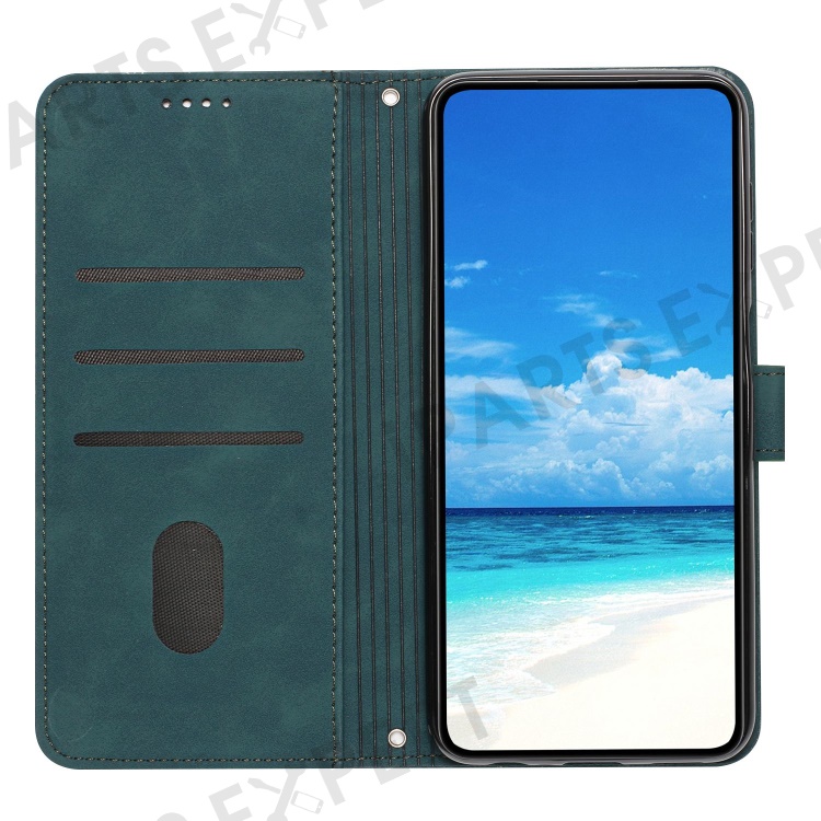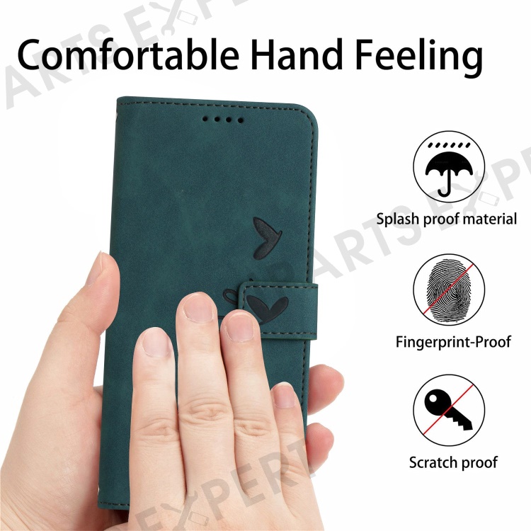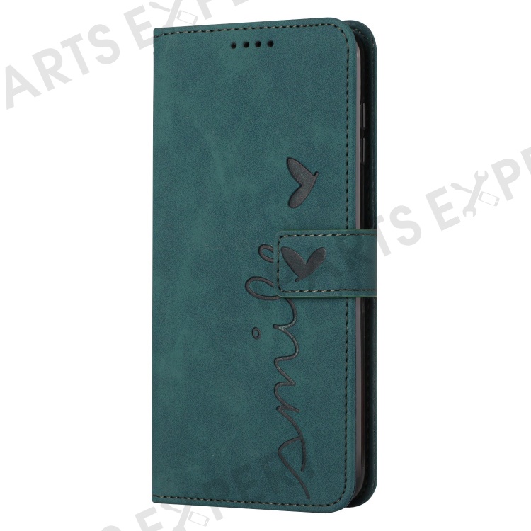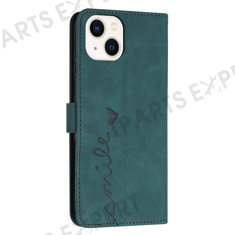Skin-touch Heart Shape Imprinted Case for iPhone 14 6.1 inch, PU Leather Stand Wallet Magnetic Clasp Phone Cover with Strap - Green