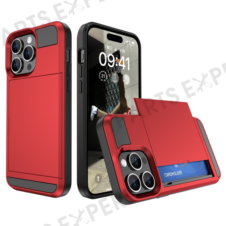 Sliding Card Holder Phone Case for iPhone 15 Plus , Anti-drop PC + TPU Back Cover - Red