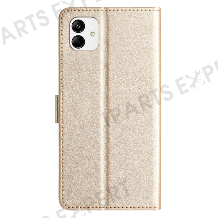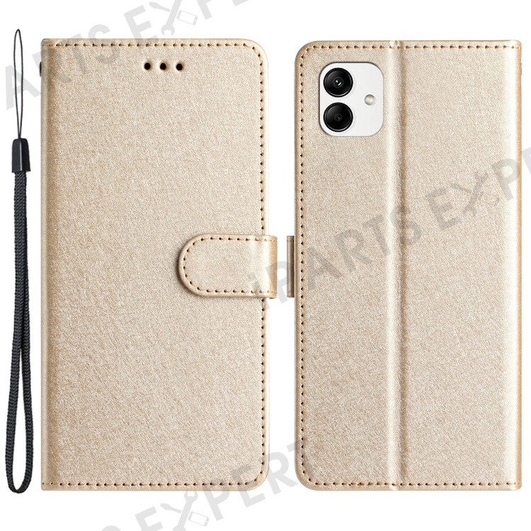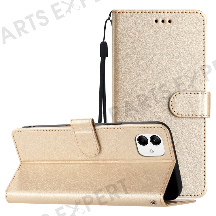 Smart Phone Stand Case for Samsung Galaxy A04e 4G / F04 4G / M04 4G , Silk Texture PU Leather Wallet Shell with Hand Strap - Gold
