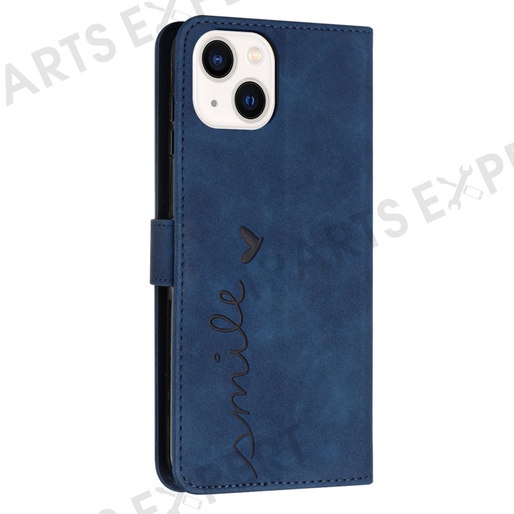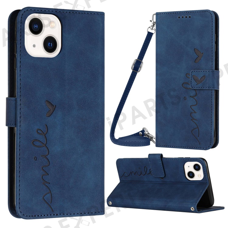 Stand Case for iPhone 13 / 14 6.1 inch, Anti-drop Heart Shape Imprinted Wallet Skin-touch Feeling PU Leather Phone Cover with Shoulder Strap - Sapphire